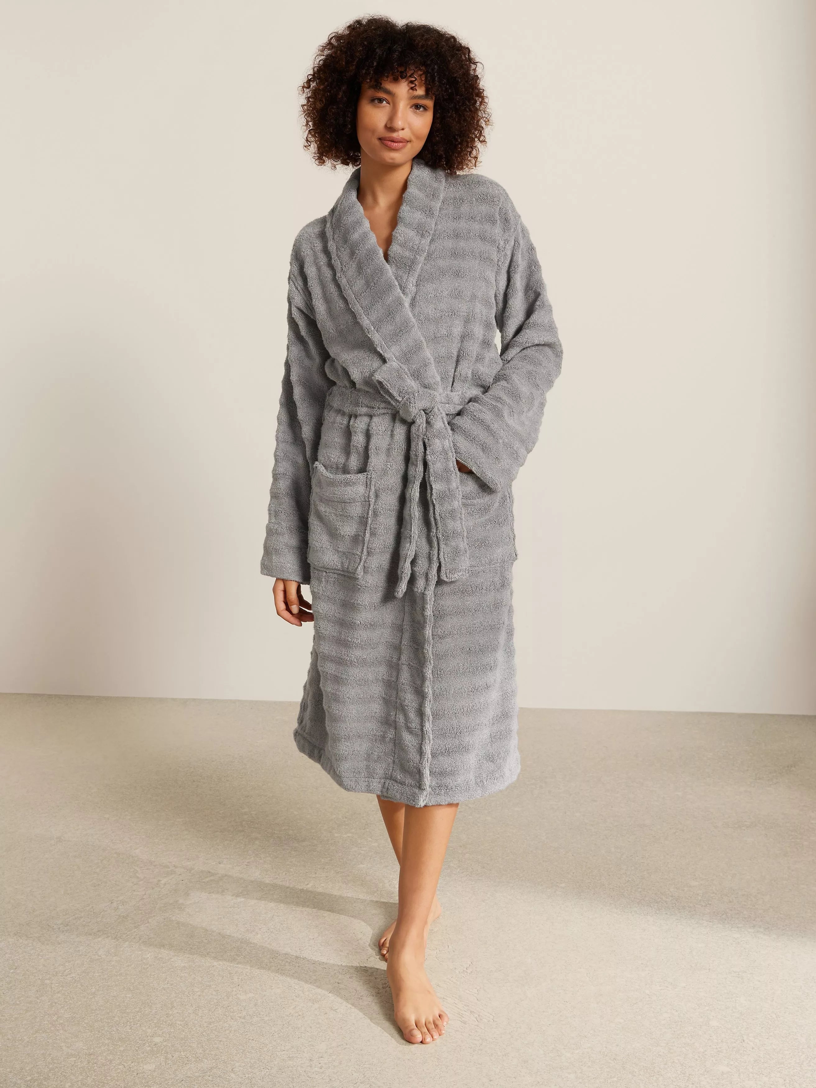 We've made this incredibly cosy bath robe from a high-quality cotton and Modal blend. You'll see they have a wave pattern which is made with yarn that's spun without twisting. This makes the robe super-soft and fluffy with high absorbency, perfect for comfort after a hot bath.