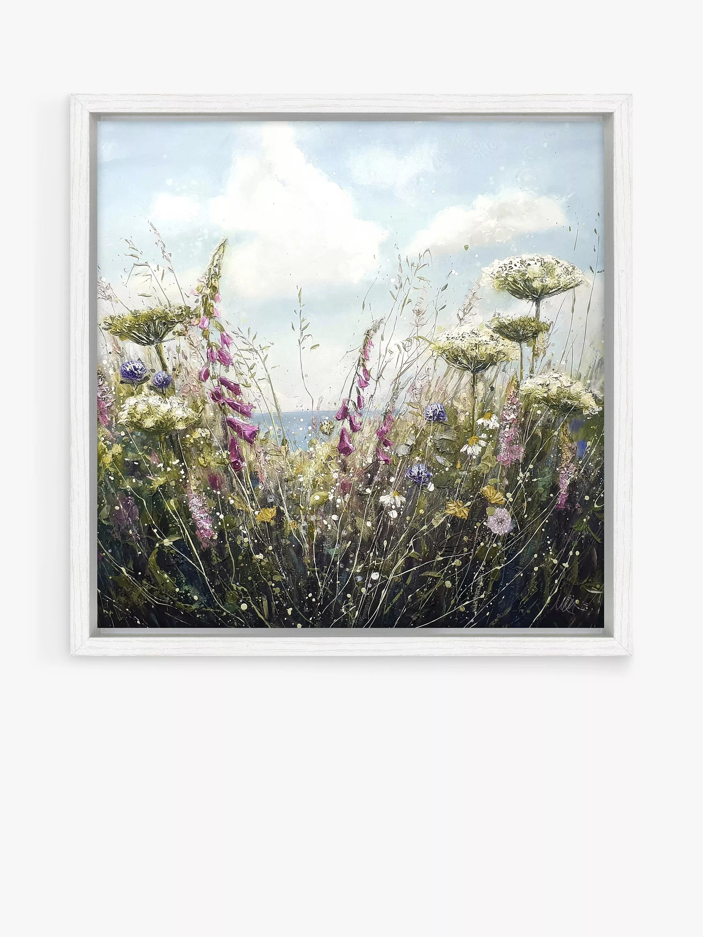 Coastal scene by artist Marie Mills. Made in the UK, printed on heavyweight canvas, stretched and float-framed in a contemporary wood-effect grained white moulding, ready to hang on your wall.