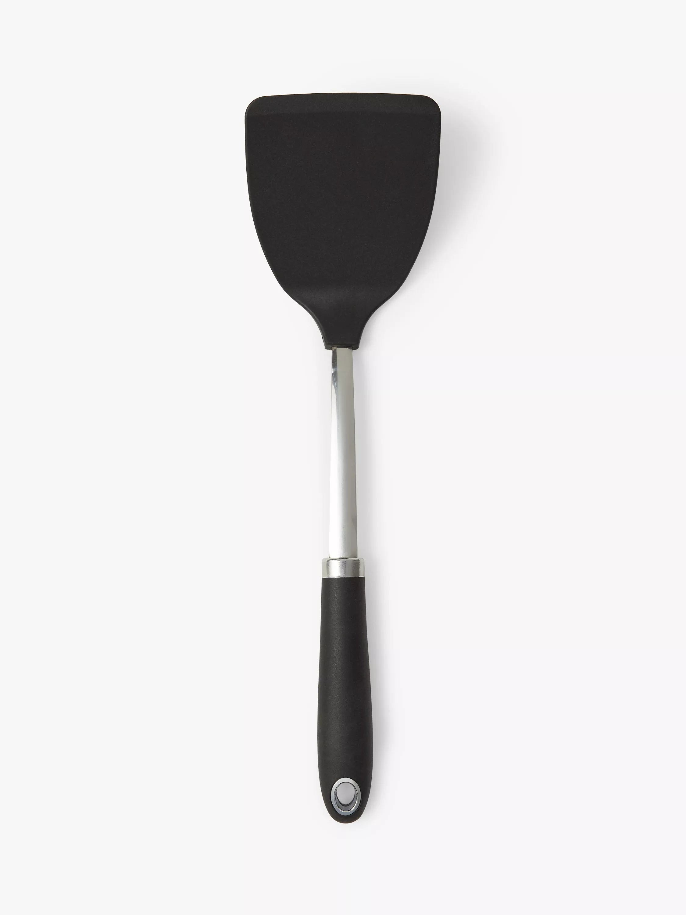 Solid turner with a heat-resistant nylon head, making it suitable for use with all cookware surfaces, including non-stick.