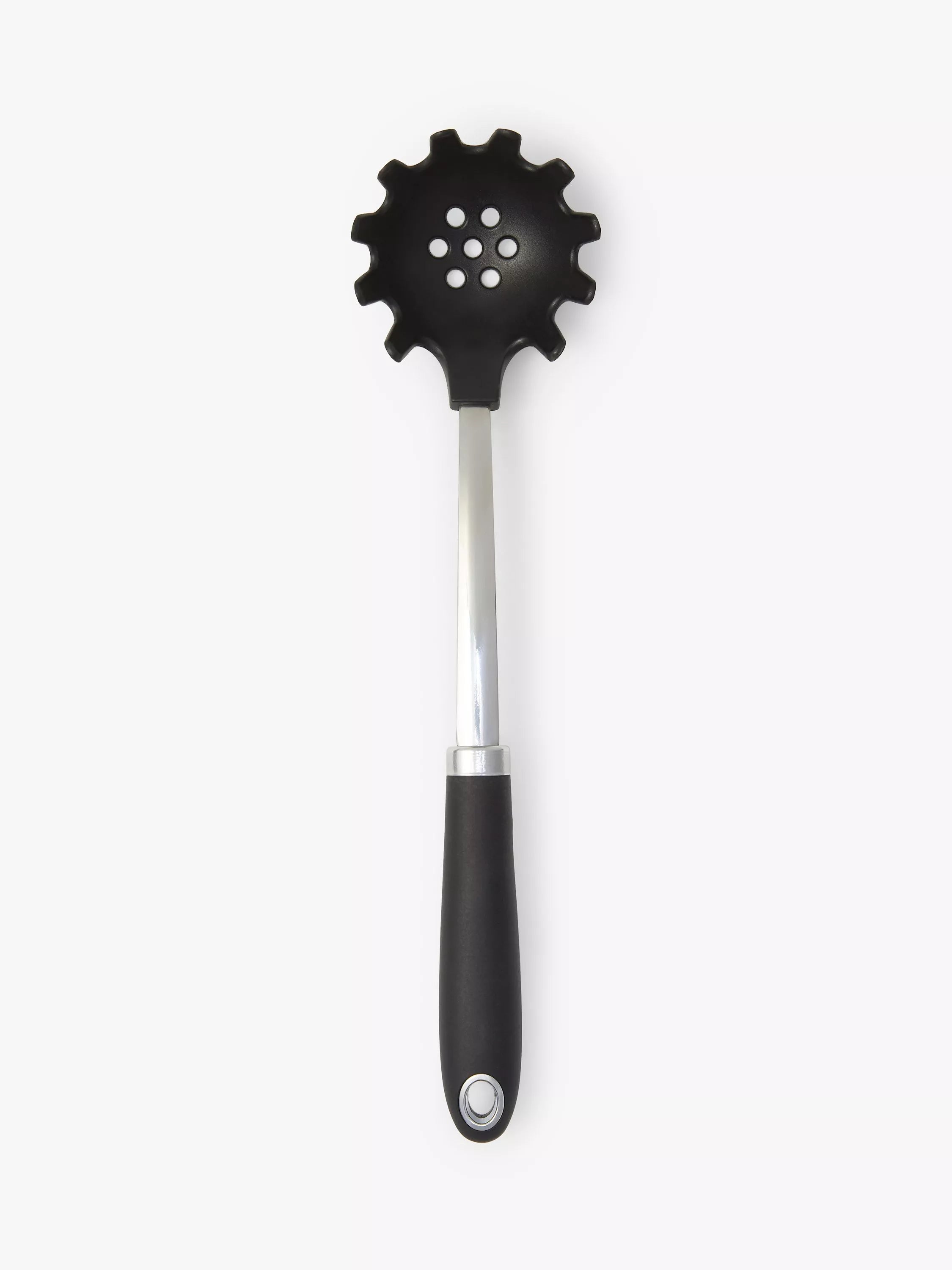Spaghetti spoon with a heat-resistant nylon head, making it suitable for use with all cookware surfaces, including non-stick.