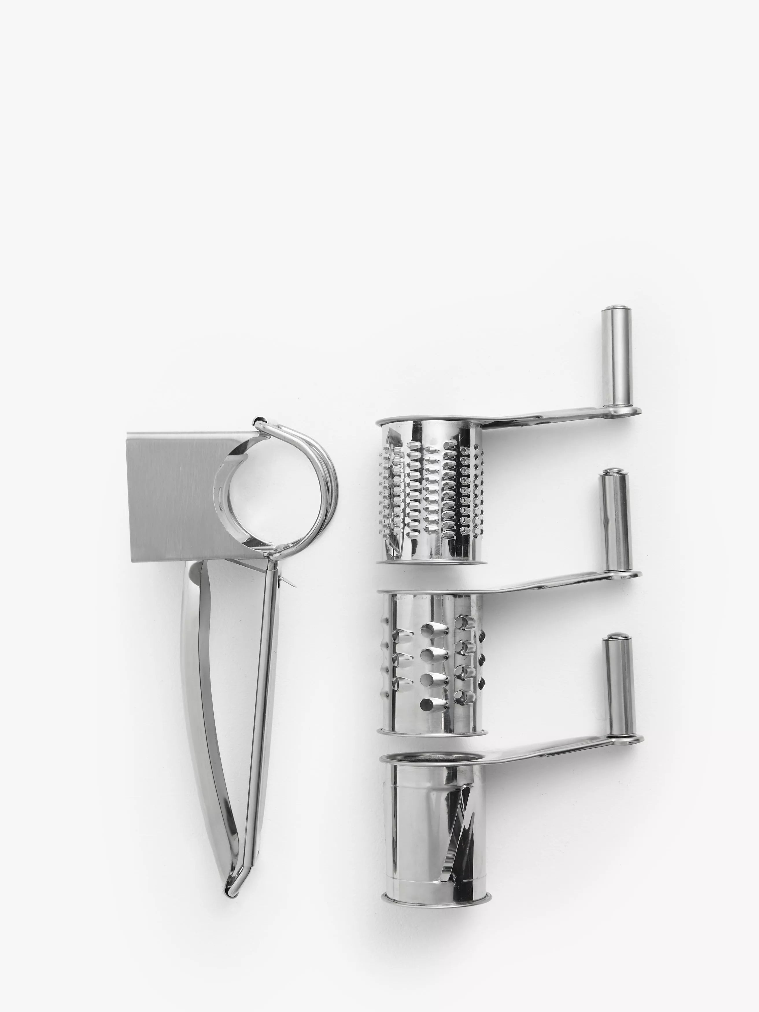 Easy to use, this rotary grater comes with three interchangeable drums for fine grating, coarse grating and slicing. It's safer to use than a traditional grater as fingers are kept away from the grating blades.