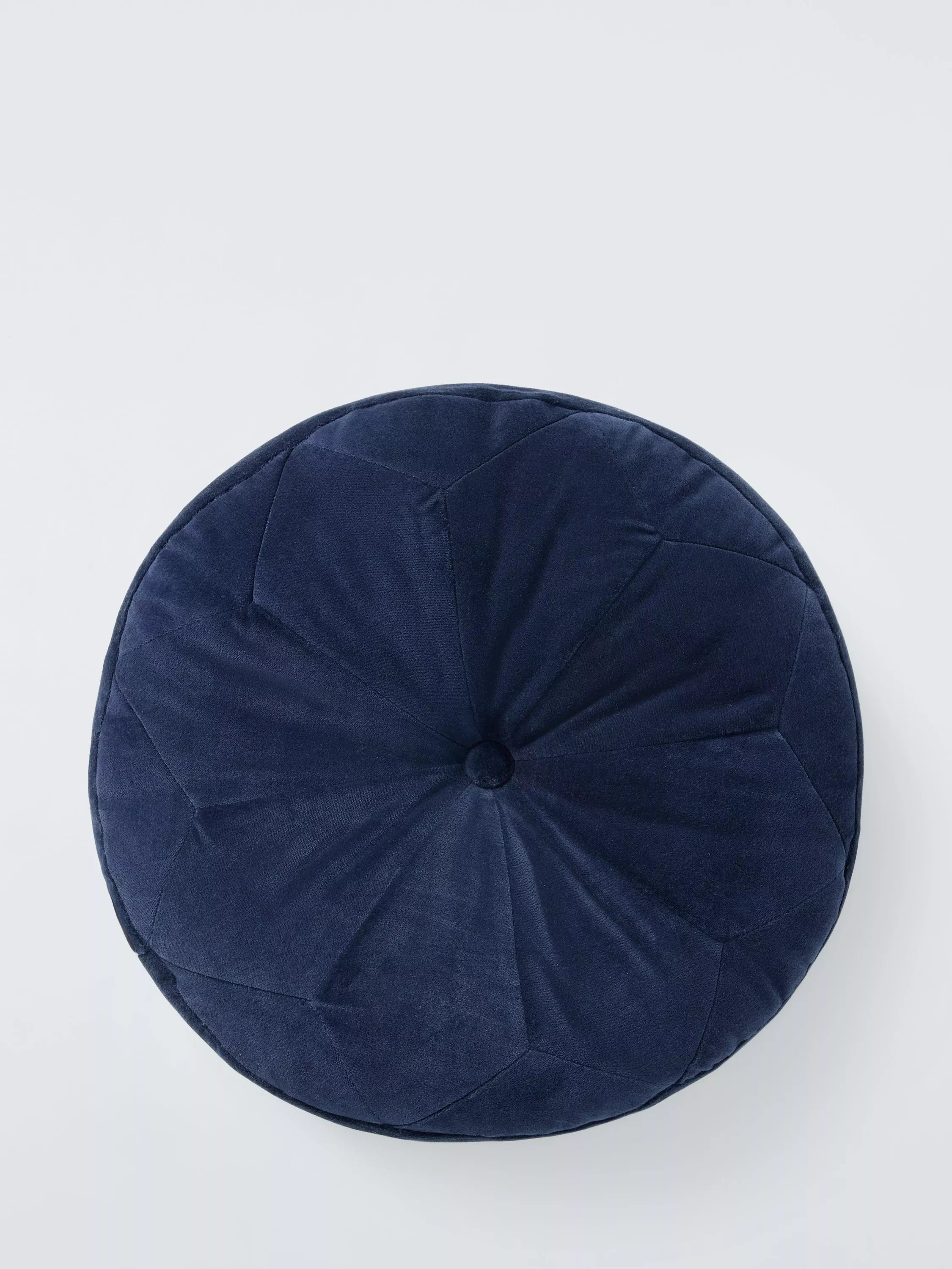 Plump round cushions in luxurious cotton velvet. A Morrocan-inspired patchwork lozenge design is finished with a central button.