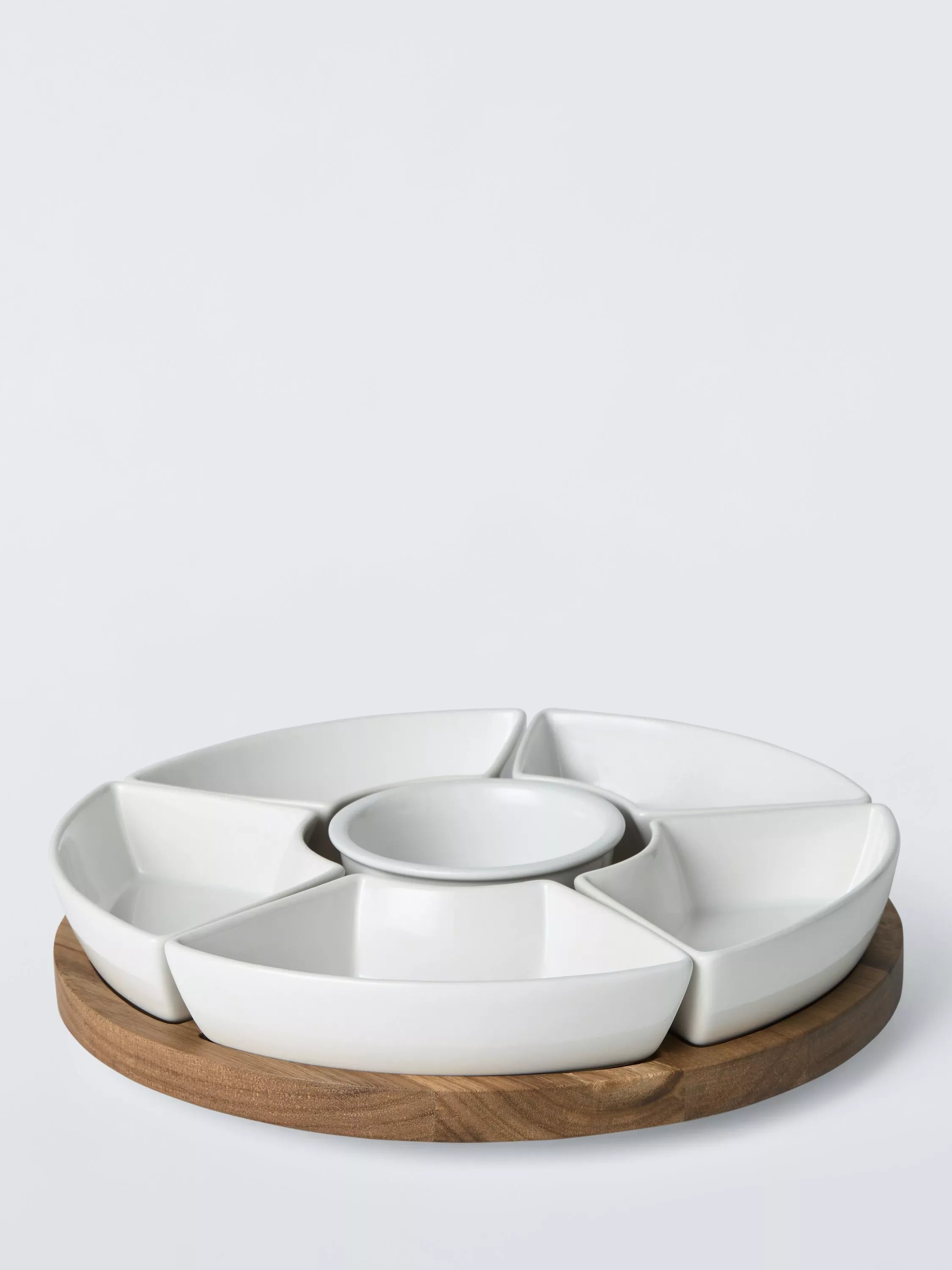 Lazy Susan for the table, made with a sleek rotation tray underneath to select food on the platter. Serve snacks in the five ceramic segments and a dip or relish in the centre pot. This base is made of acacia wood, loved for its warm tones and natural patterns.