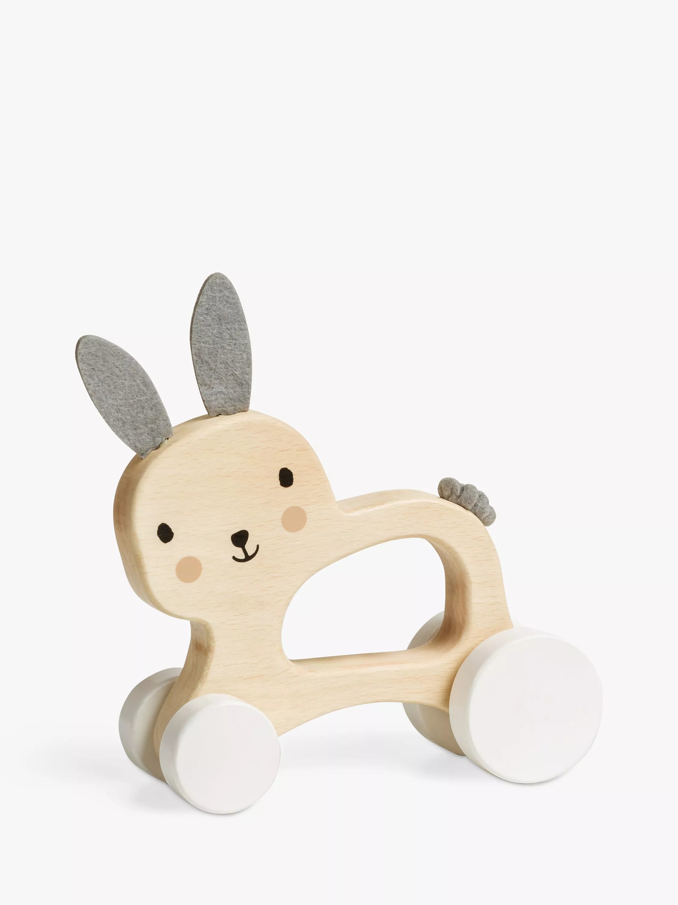 This four-wheeled bunny has soft felt ears, a fluffy tail, and sweet facial features. The cut-out body creates a small handle for little hands to hold and push the bunny along. It is designed to inspire imaginative play and improve toddlers' grasp and dexterity.