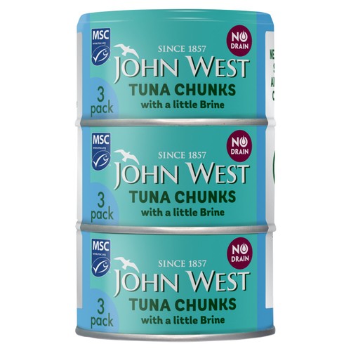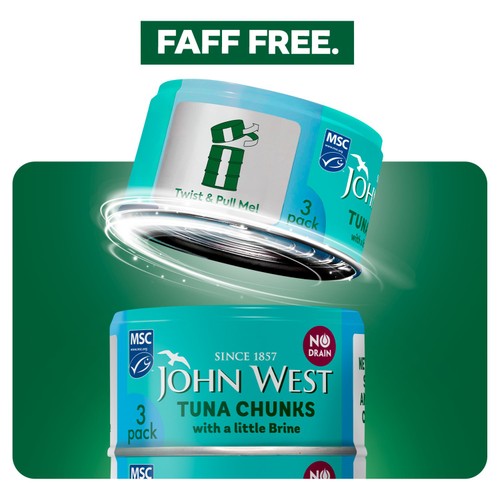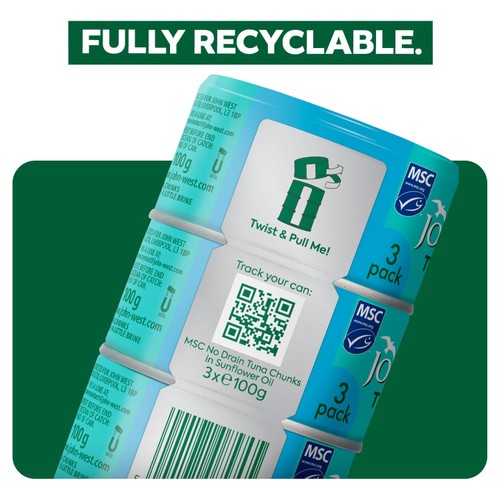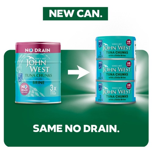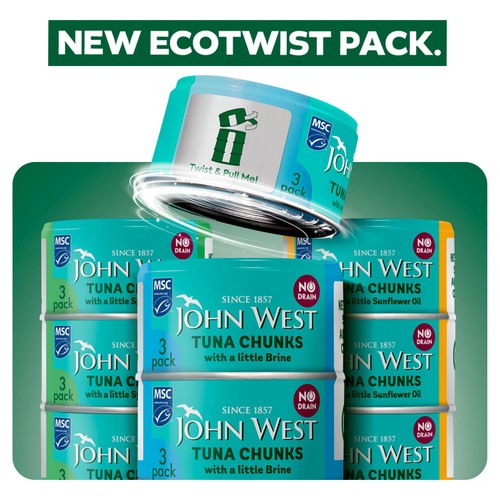 Introducing the John West No Drain multipack, featuring an easy-to-use aluminum SmartStrip for a simple twist open. This is our most eco-friendly option, eliminating messy plastic waste through fully recyclable cans. The new can design preserves the texture, keeping the tuna chunky and succulent for your meals.