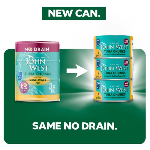 This John West No Drain multipack features tuna chunks preserved in a little sunflower oil, maintaining a chunky and succulent texture. The innovative packaging is designed to be eco-friendly and convenient for quick meal preparation.