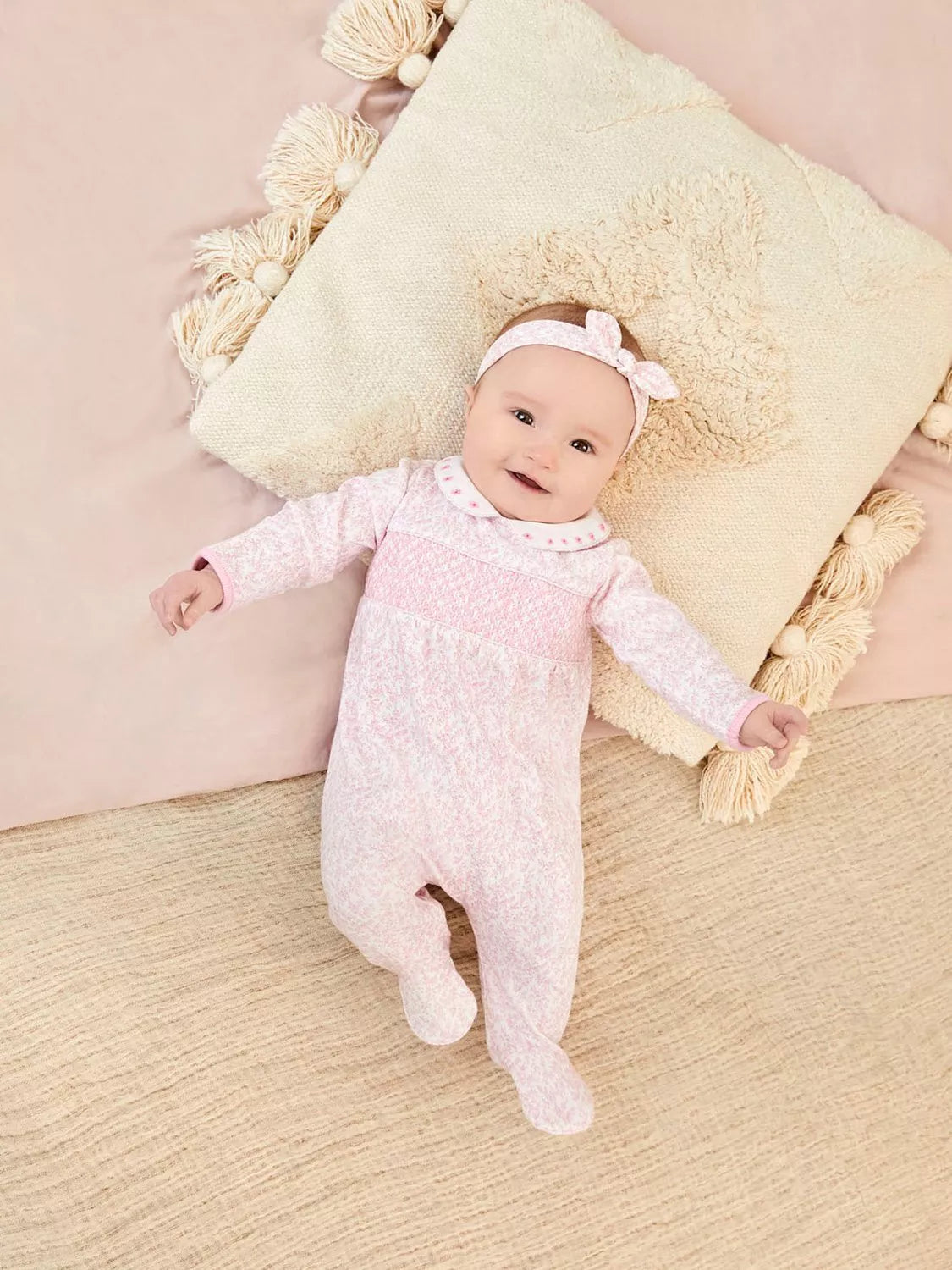This Peter Pan collar sleepsuit offers a smarter look. The floral all-over print and traditional smocking is timeless, while soft and breathable cotton helps keep baby comfy all day long.