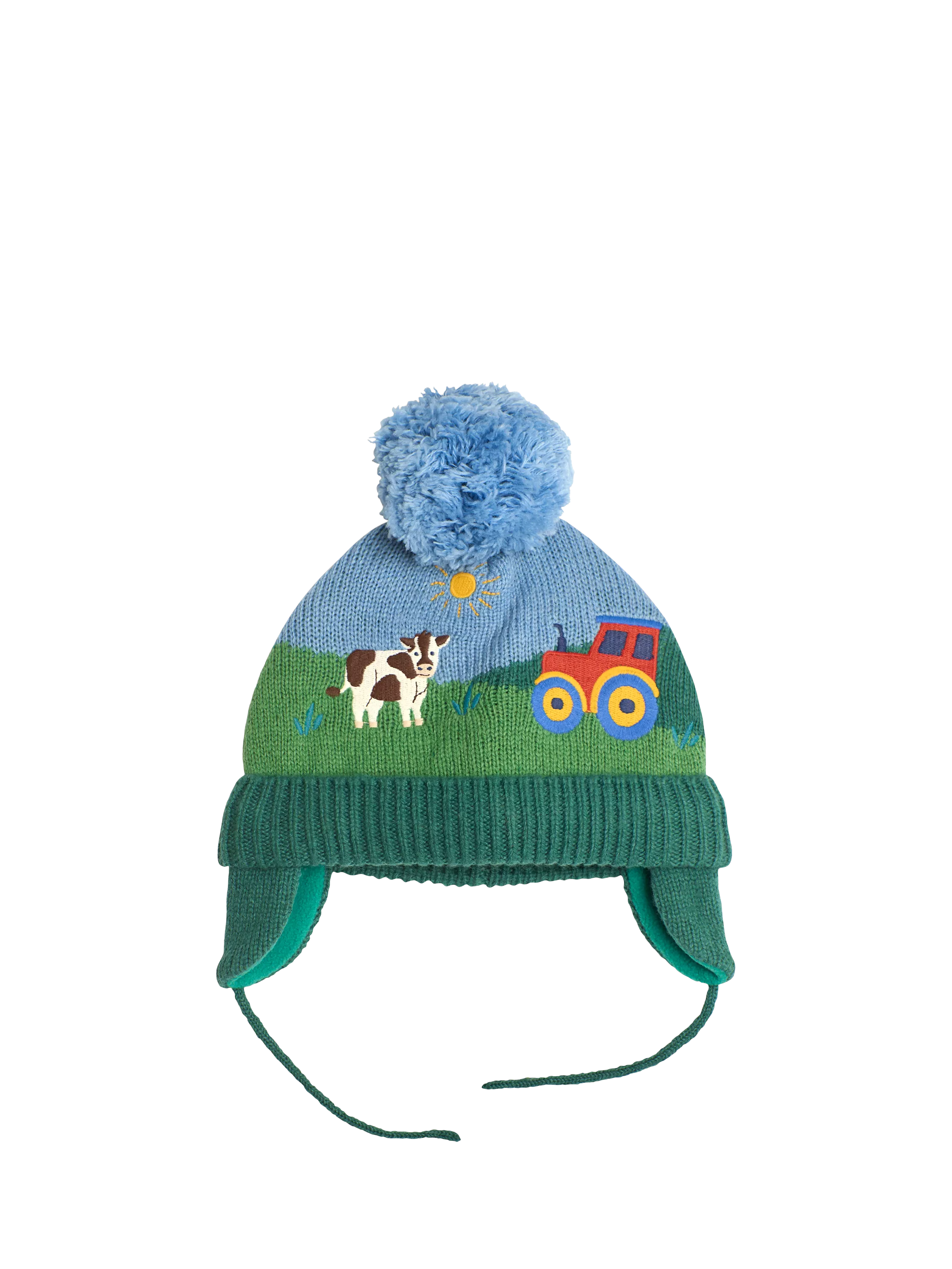 Made with wool and designed with tractor scene appliqué, this hat will keep their ears, head and face warm and snug on the chilliest days. There are ties to fasten under the chin so it will stay put, even during the most active playtime, plus its fleece lining adds extra cosiness. It's unrestrictive, flexible and finished with a cute pom pom on the top.