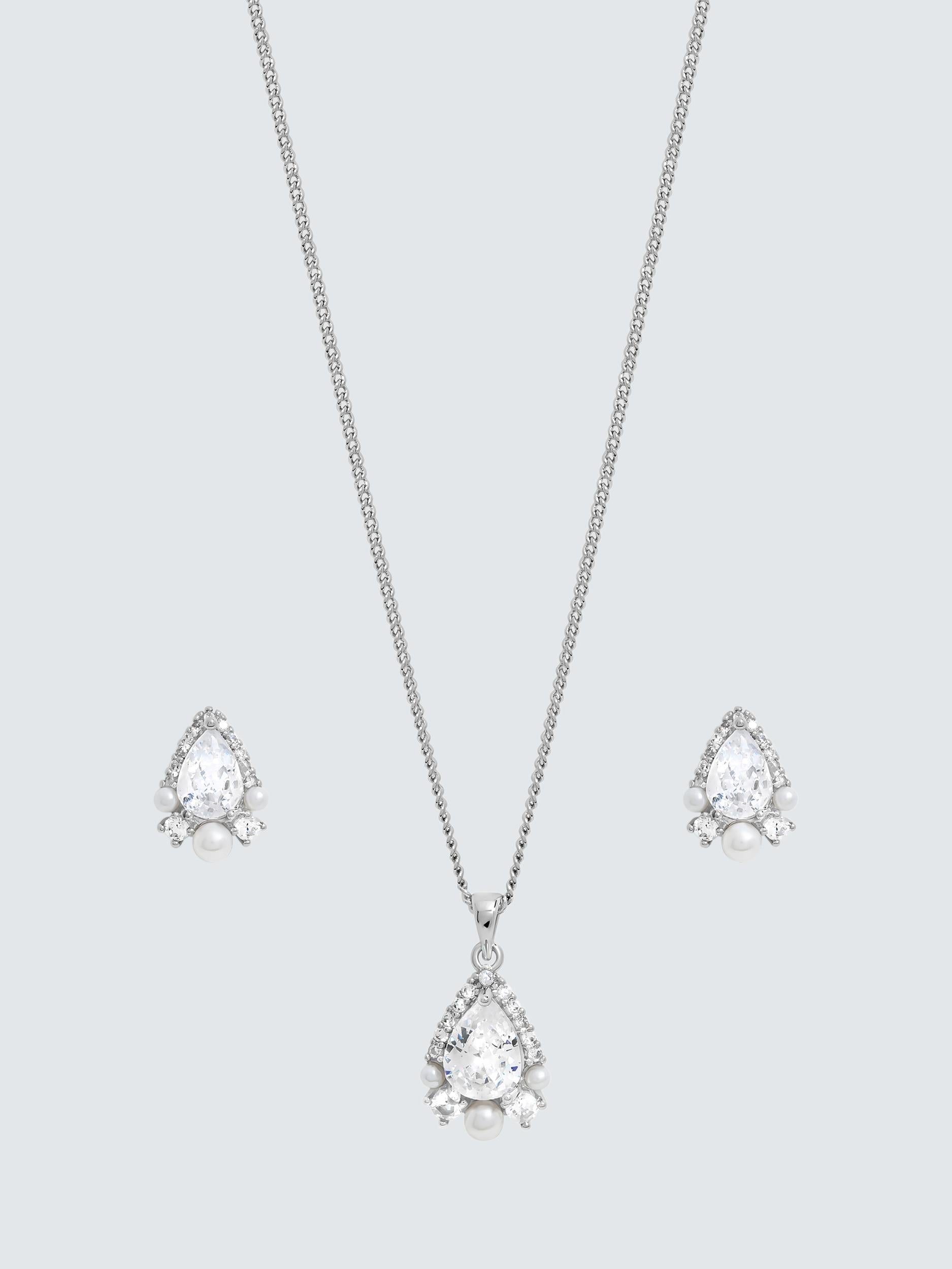 This Jon Richard box set presents elegant jewellery, perfectly paired for any special occasion or thoughtful presentation. It comprises a rhodium-plated necklace and matching drop earrings, each featuring pear-shaped cubic zirconia stones beside lustrous simulated pearls. This coordinated ensemble offers enduring sparkle and sophistication.