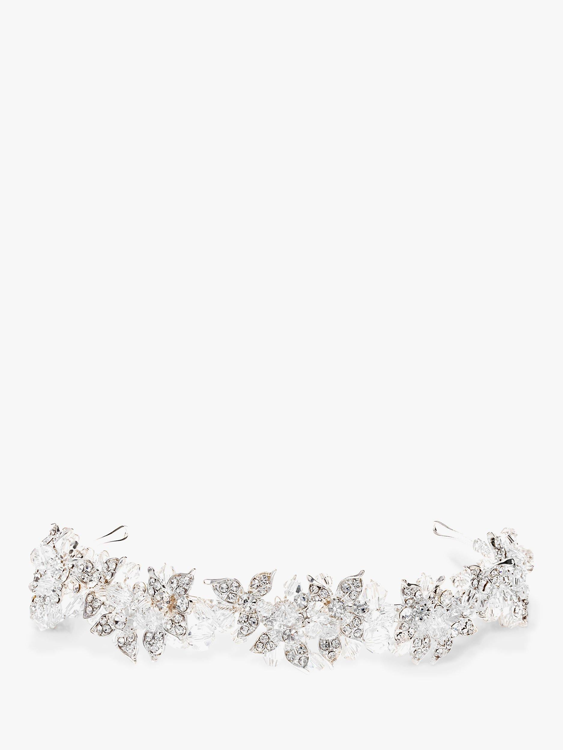 This Jon Richard Headband is crafted with a rich silver plated construction featuring intricate leaf details and decorative beads. It offers an immediate touch of elegant glamour designed specifically to enhance your hairstyle presentation for any occasion requiring sophisticated aesthetic appeal and quality finish in bridal wear or evening wear.