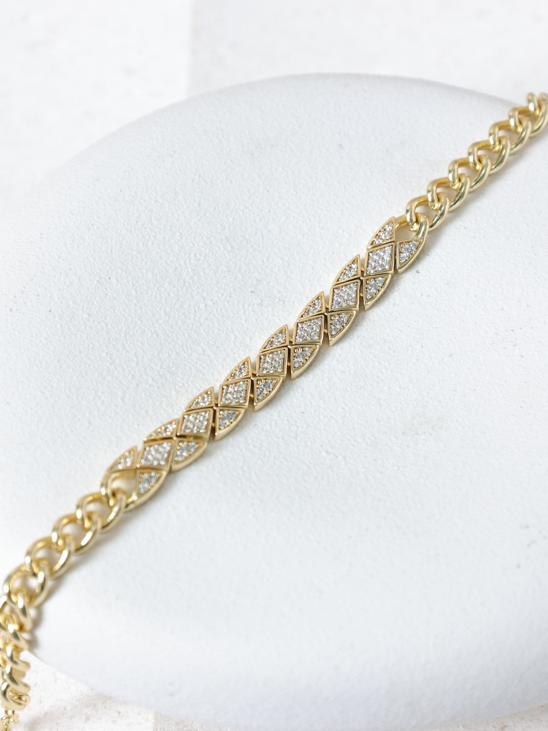 Our 14k Gold Plated and Pave Link Bracelet is a modern classic with a hint of sparkle. Featuring polished gold plated links accented with pave set stones, this bracelet adds effortless elegance to any look. Whether worn alone or layered, it’s a chic and timeless addition to your jewellery collection. Fastening: Lobster Clasp. Width dimension: 10mm. Length dimension: 10mm. Chain Length: 8". Material: 14K Gold Plated Base Metal.