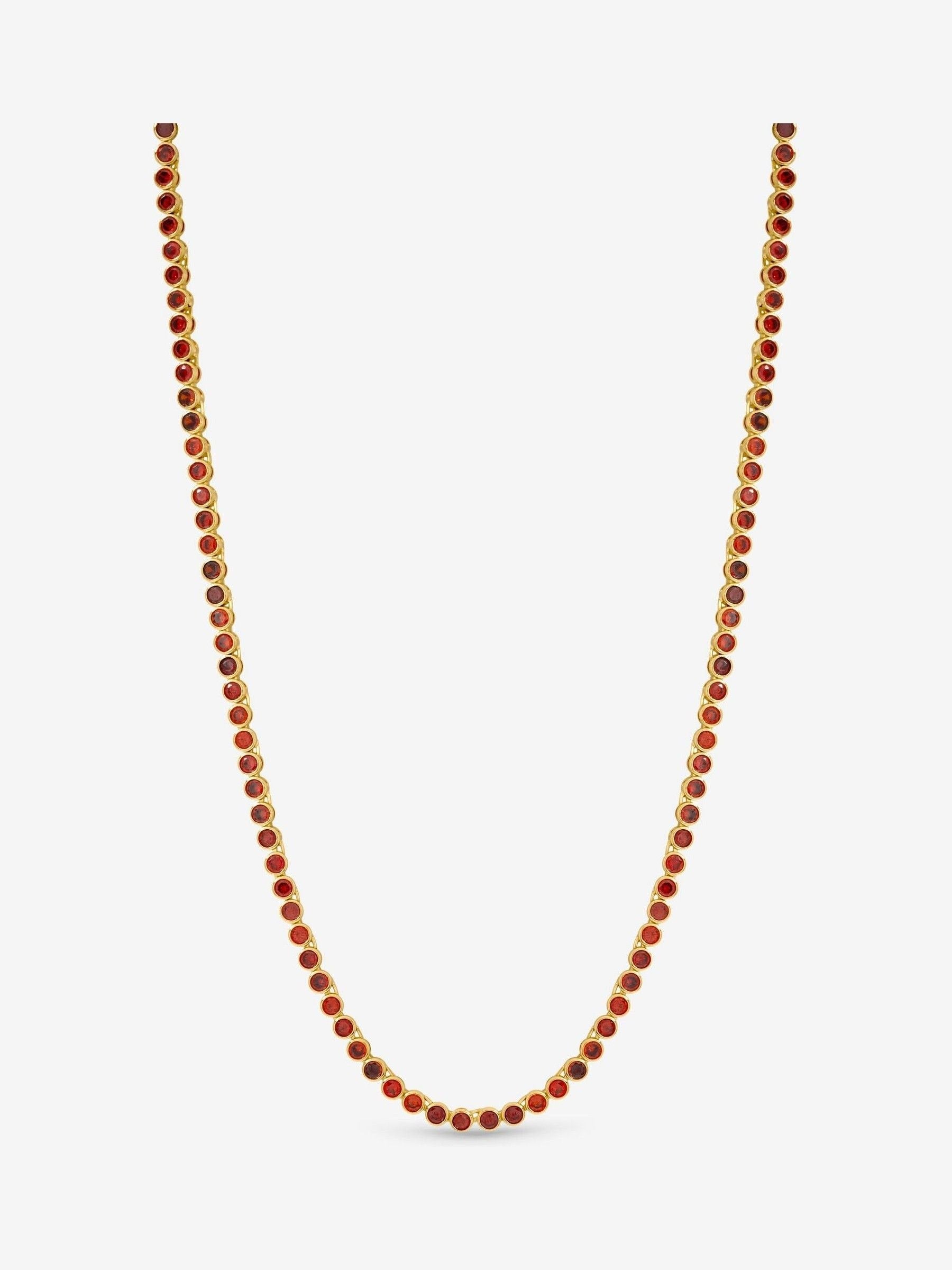 Our 14k Gold Plated and Red Cubic Zirconia Tennis Necklace is expertly finished, designed to bring bold elegance to your everyday style. Featuring striking red crystals, made to sparkle and finished in rich gold plating, this piece adds a touch of timeless sophistication. It is the perfect addition to any jewellery collection. Fastening: Lobster Clasp. Width dimension: 4mm. Length dimension: 4mm. Chain Length: 16". Material: 14K Gold Plated Base Metal.