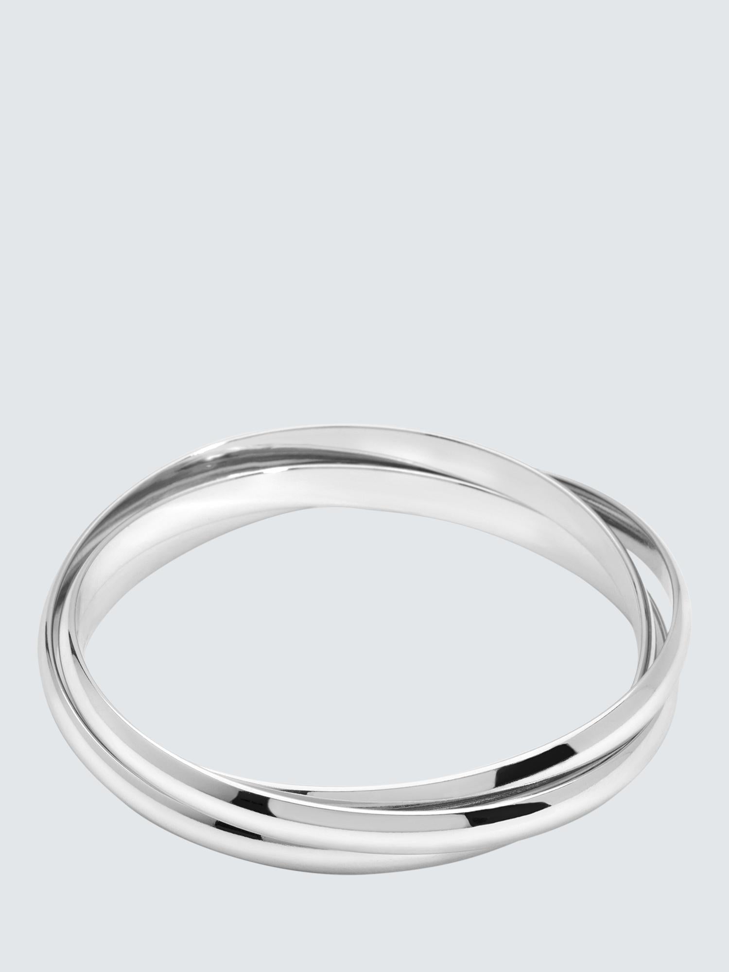 Explore the Jon Richard Interlocking Bangles in a refined silver tone, providing versatile elegance. This set features two polished rings interlocked for a unique, modern aesthetic. Wear these pieces together or style them individually for adaptable, striking wristwear suitable for daily wear. Achieve a sophisticated, layered look with this distinctive set.