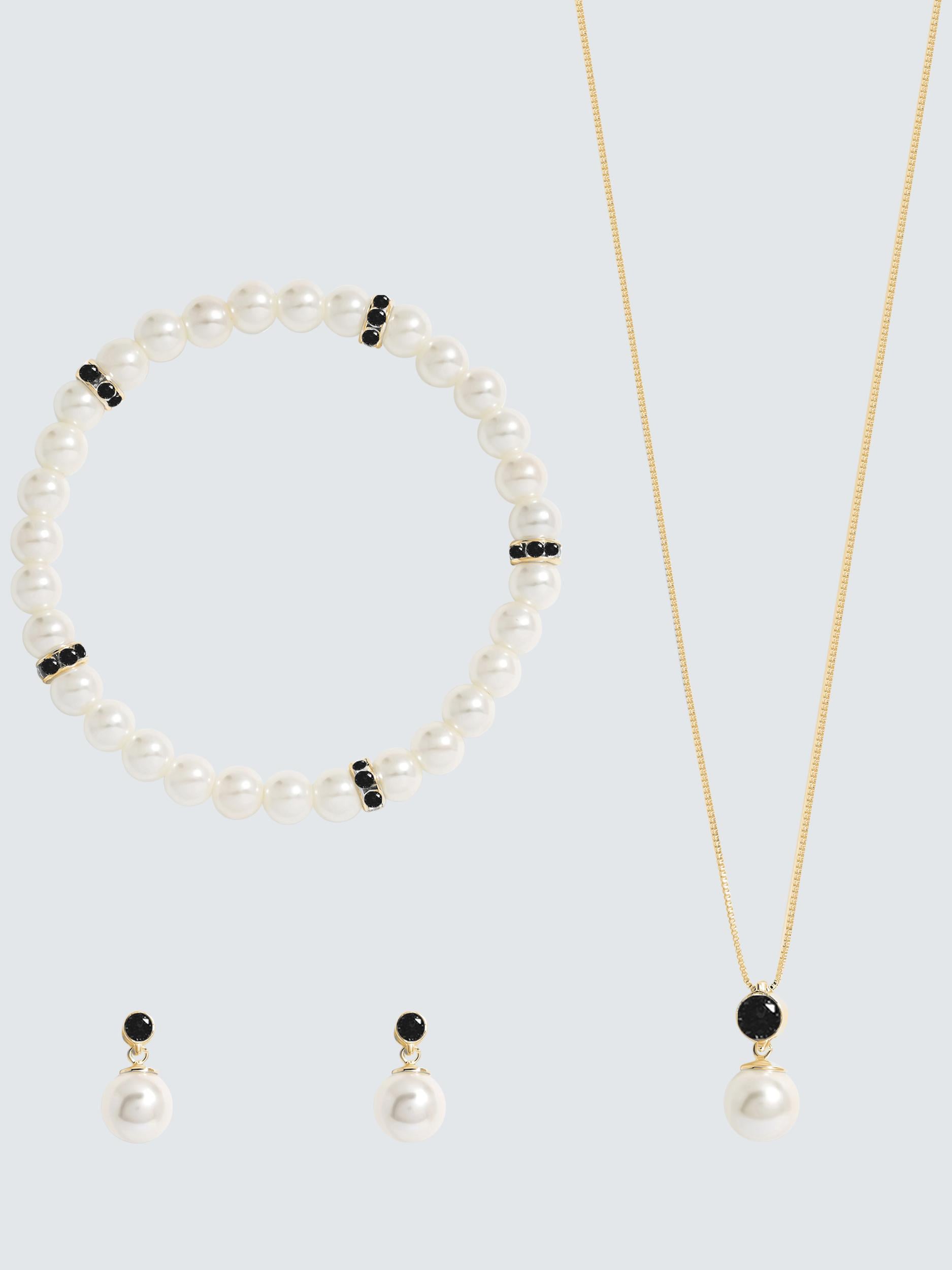 This Jon Richard Jet And Pearl Trio Set Gold is an elegant jewellery collection perfect for gifting or treating yourself this season. It features a coordinated necklace, stretch bracelet, and matching earrings designed for pierced ears only. All pieces secure nicely and arrive in a beautiful Jon Richard presentation box.