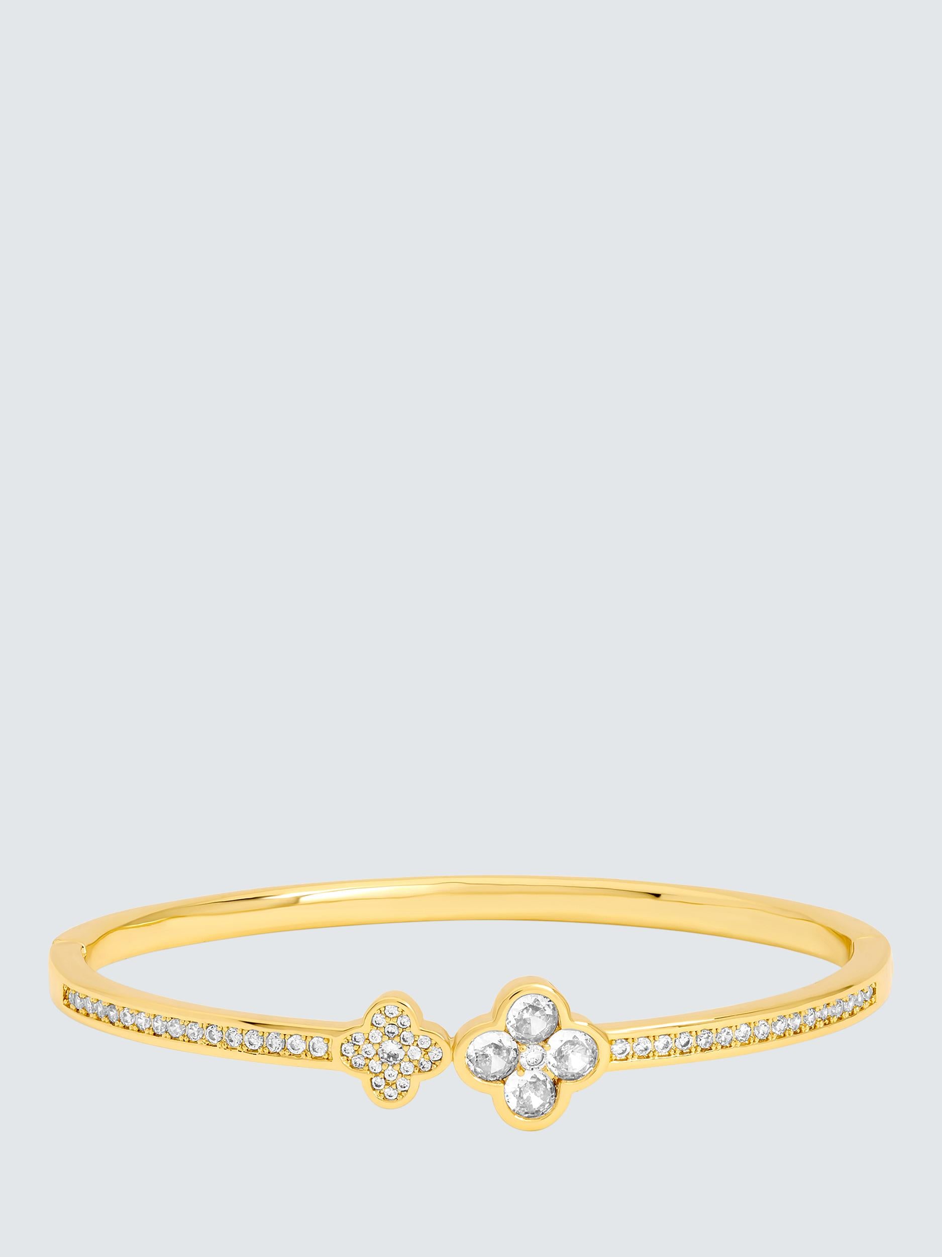 This Jon Richard Pave Clover Bangle in a rich gold finish offers an elegant touch to your daily accessories collection. Expertly crafted, this bracelet features striking pave crystals designed for maximum sparkle and sophisticated appeal. Wear this beautiful, timeless piece to easily elevate any ensemble, ensuring charm is always present, daily.