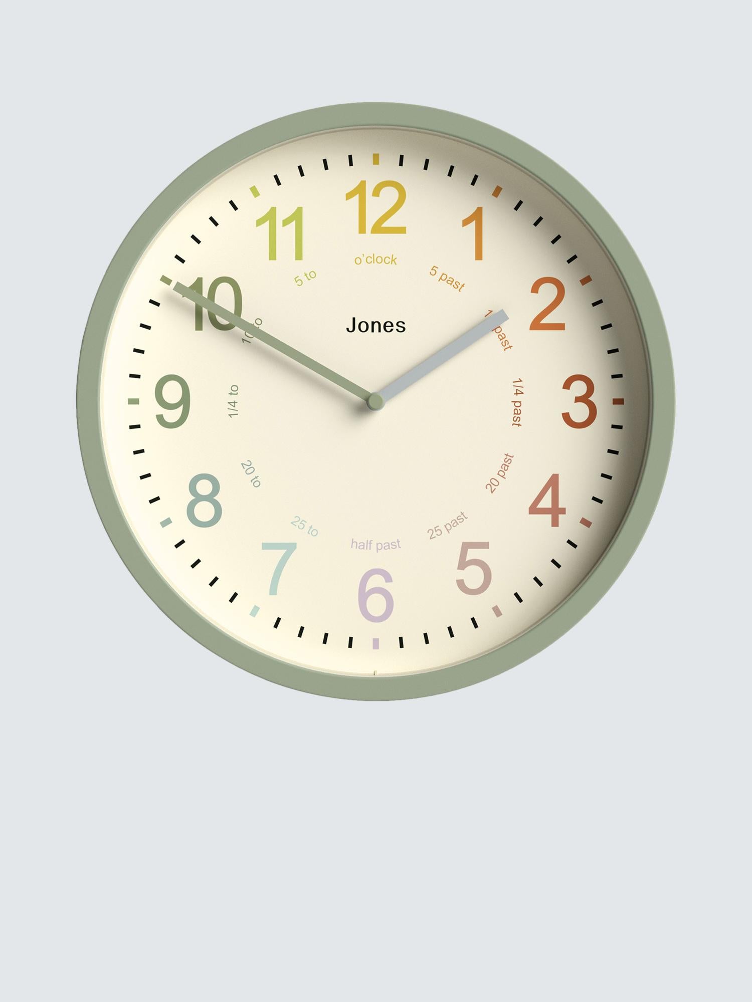 4.7/5 A modern, children's wall clock with easy-to-read time descriptions. Make learning to tell the time stylish and fun with this simple round clock. Designed with an acrylic case in a matt finish, a multi-coloured Arabic numeral dial and metal hands under a glass lens. Ideal for a child's bedroom, playroom, nursery or school classroom.