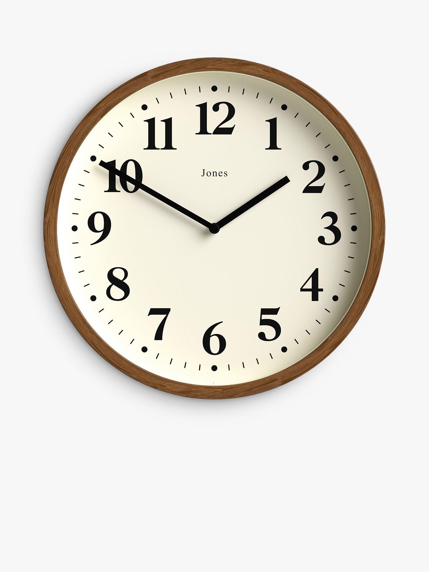 4.9/5 A faux dark wood acrylic case, with a bold Arabic dial, the Lodge wall clock from Jones Clocks has metal hands under a glass lens. Wall-mount this modern wall clock to refresh a kitchen, office or hallway. This ticking clock has quartz movement for energy-efficient precision time-keeping.