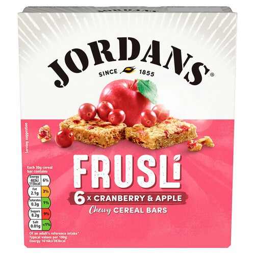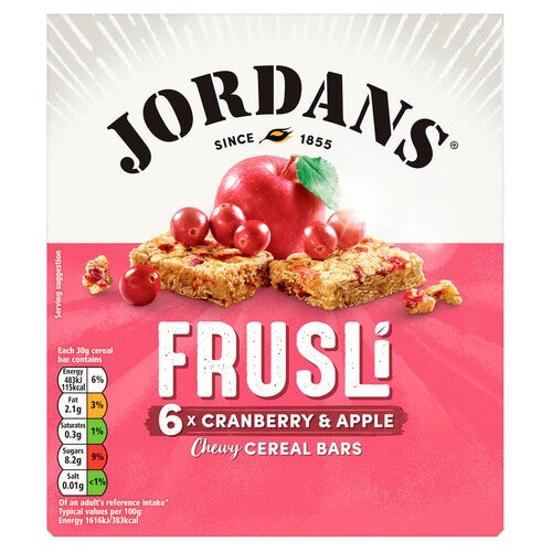 Jordans Frusli Cranberry & Apple bars provide a satisfying, chewy snack experience. They are carefully crafted by blending creamy wholegrain oats with sweet apples and tangy cranberries for complex flavour.