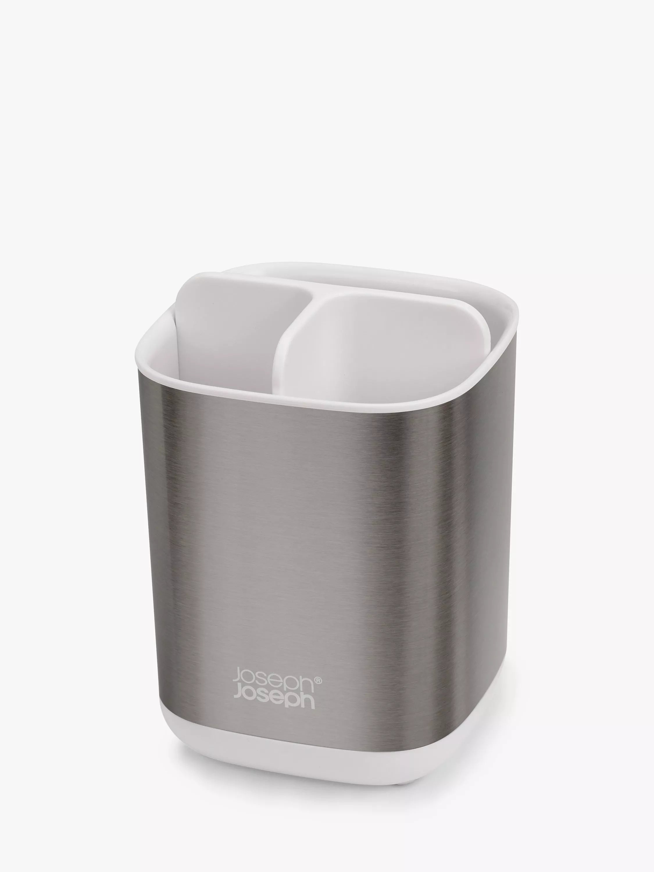 A compact toothbrush holder from Joseph Joseph with three sections for toothbrushes and toothpaste.
