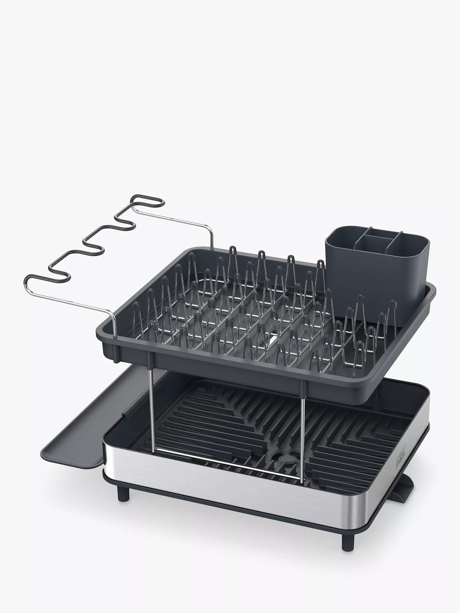 There's a wine glass holder for safely draining delicate glassware and a moveable cutlery holder that can store either inside the top rack or hooked onto the outside of the lower rack for extra draining space.Raised ribs in the base prevent water from being trapped under cups and bowls and an integrated spout - which can be set at either the front or the side of the unit - allows water to drain straight into the sink.