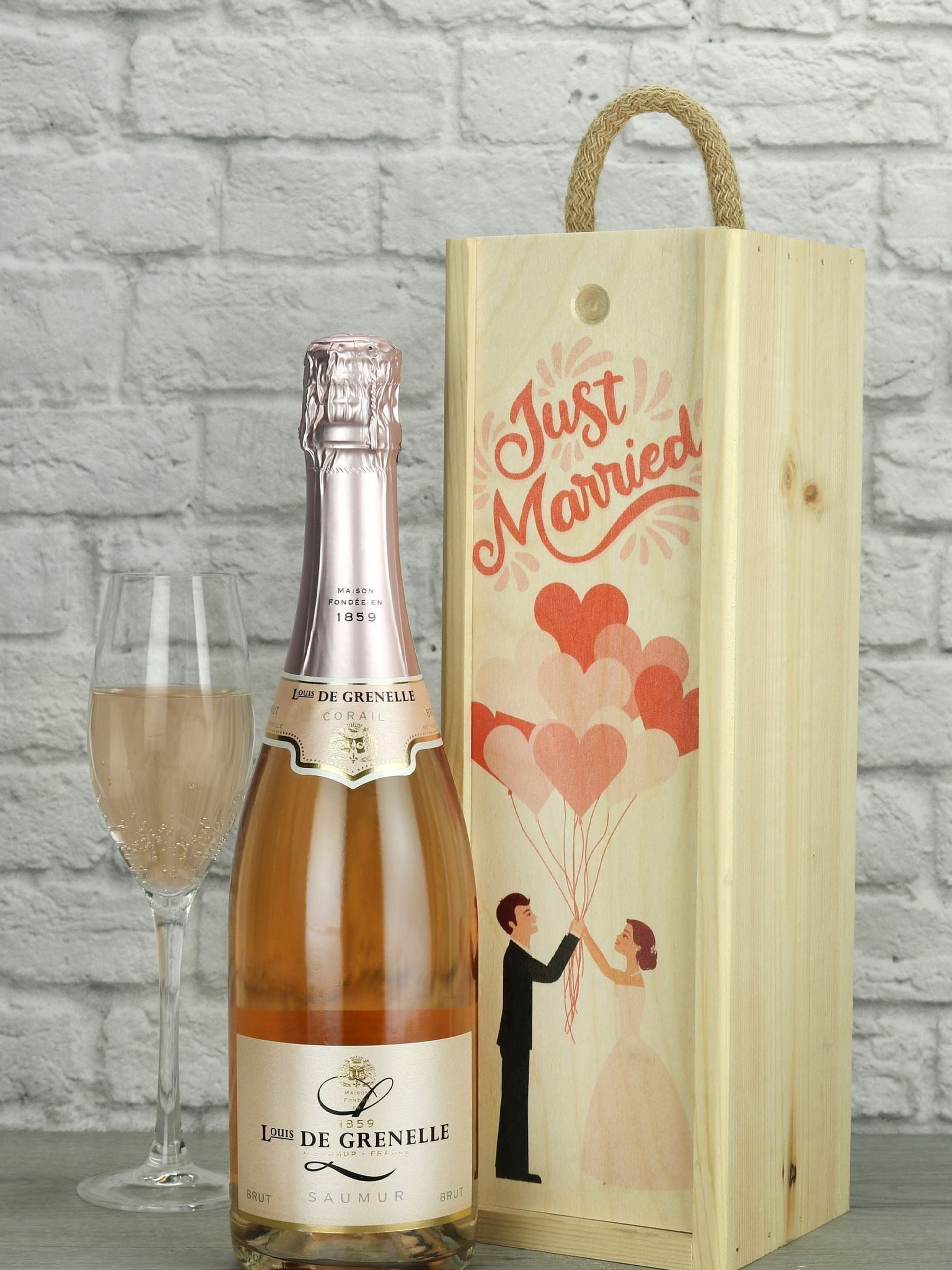 For the happy couple on their wedding day. This 'Just Married' gift features a bottle of Louis de Grenelle sparkling Saumur rose wine from France's Loire Valley. Deep pink in colour and flecked with fine bubbles the bouquet is a festival of small red fruit and flowers. On the palate, the wine presents notes of sour candies and red fruit. Presented in a wedding themed wooden gift box. Volume 750ml, ABV 12.0%. (Glass not included. If a product is out of stock a suitable replacement will be substituted). Perishable items such as food, plants, drinks and fresh flowers cannot be returned. This does not affect your right to return faulty items.