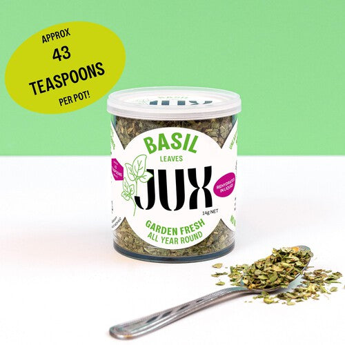 JUX Basil brings instant fresh flavour, minus the chopping, wilting or waste. This versatile herb is freeze-dried to lock in flavour, colour, aromas and nutrients. Use it as a straight swap for fresh or dried basil in all your favourite recipes ...no limp bunches or muddy chopping boards required! Sprinkle straight into cooking or rehydrate in oil first for a softer, freshly picked texture. A little goes a long way & every sprinkle of JUX counts towards your weekly plant points.