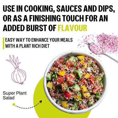 JUX Red Onion is your shortcut to vibrant veg-packed meals, without the tears! Our Red Onion is perfectly diced and freeze-dried to lock in flavour, colour, and nutrients. Use JUX as a salad topper straight from the pot, or toss right into your cooking to boost your plant intake without any prep or waste. Use it as a straight swap for fresh red onion in in all your favourite recipes. Add directly into your cooking or rehydrate in liquid for a few minutes first for a softer texture (ideal for when you're after that just-chopped feel).