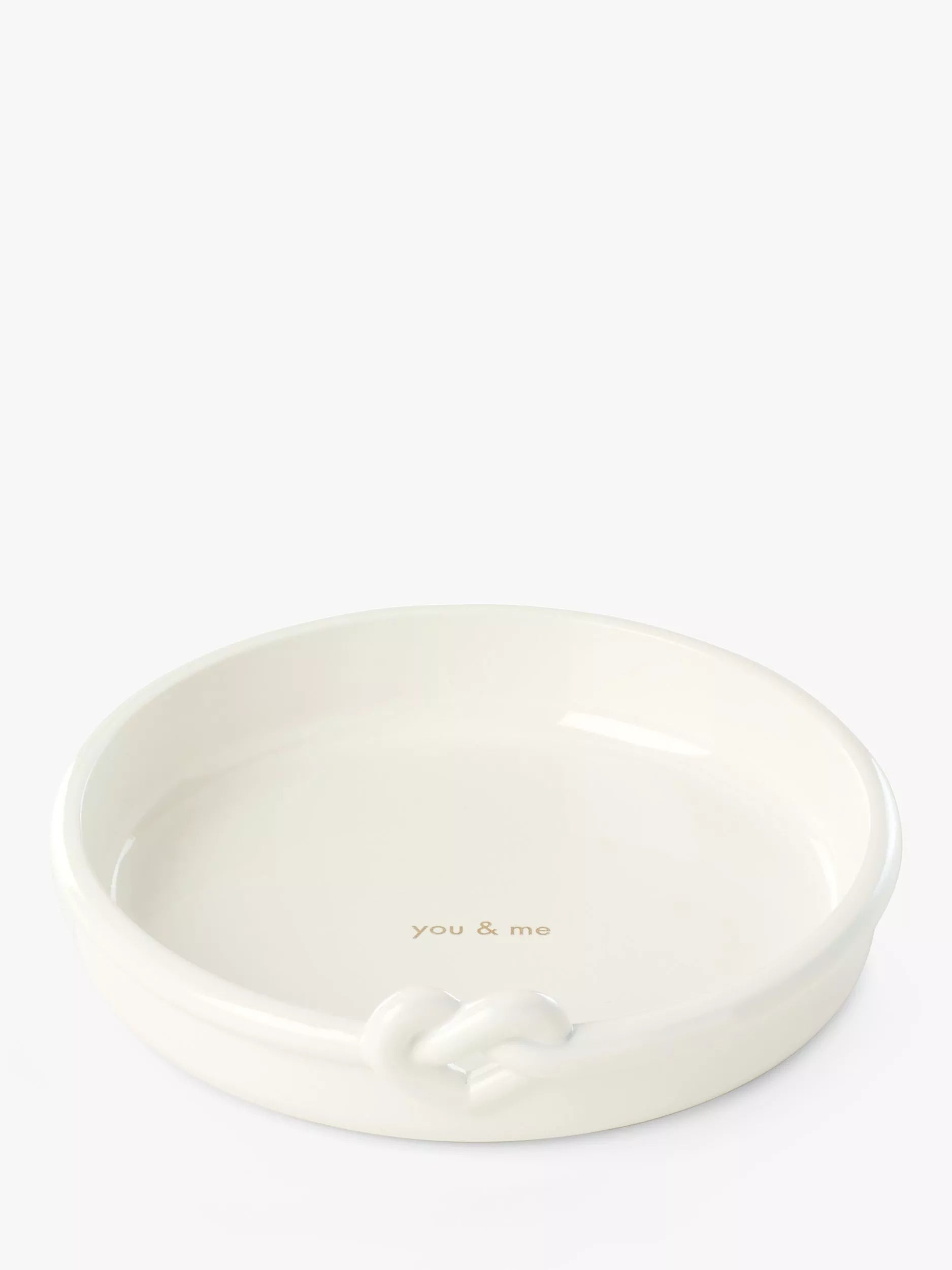 The raised lip of this kate spade new york ring dish comes together at the front in a knot that resembles a heart. This subtle emblem and the 'you & me' message printed on the dish make it a sweet place to keep your and your partner's rings.