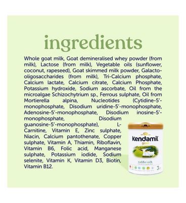 Whole Goat Milk Goat Demineralised Whey Powder (from Milk) Lactose (from Milk) Vegetable Oils (Sunflower, Coconut, Rapeseed) Goat Skimmed Milk Powder Galacto-Oligosaccharides (from Milk) Tri-Calcium Phosphate Calcium Lactate Calcium Citrate Calcium Phosphate Potassium Hydroxide Sodium Ascorbate Docosahexaenoic Acid Nucleotides (Cytidine-5'-Monophosphate, Disodium Uridine-5'-Monophosphate, Adenosine-5'-Monophosphate, Disodium Inosine-5'-monophosphate, Disodium Guanosine-5' Monophosphate) Ferrous Sulphate Arachidonic Acid L-Carnitine Vitamin E Zinc Sulphate Niacin Calcium Pantothenate Copper Sulphate Vitamin A Thiamin Riboflavin Vitamin B6 Folic Acid Manganese Sulphate Potassium Iodide Sodium Selenite Vitamin K Vitamin D3 Biotin Vitamin B12For allergens see ingredients in Bold.