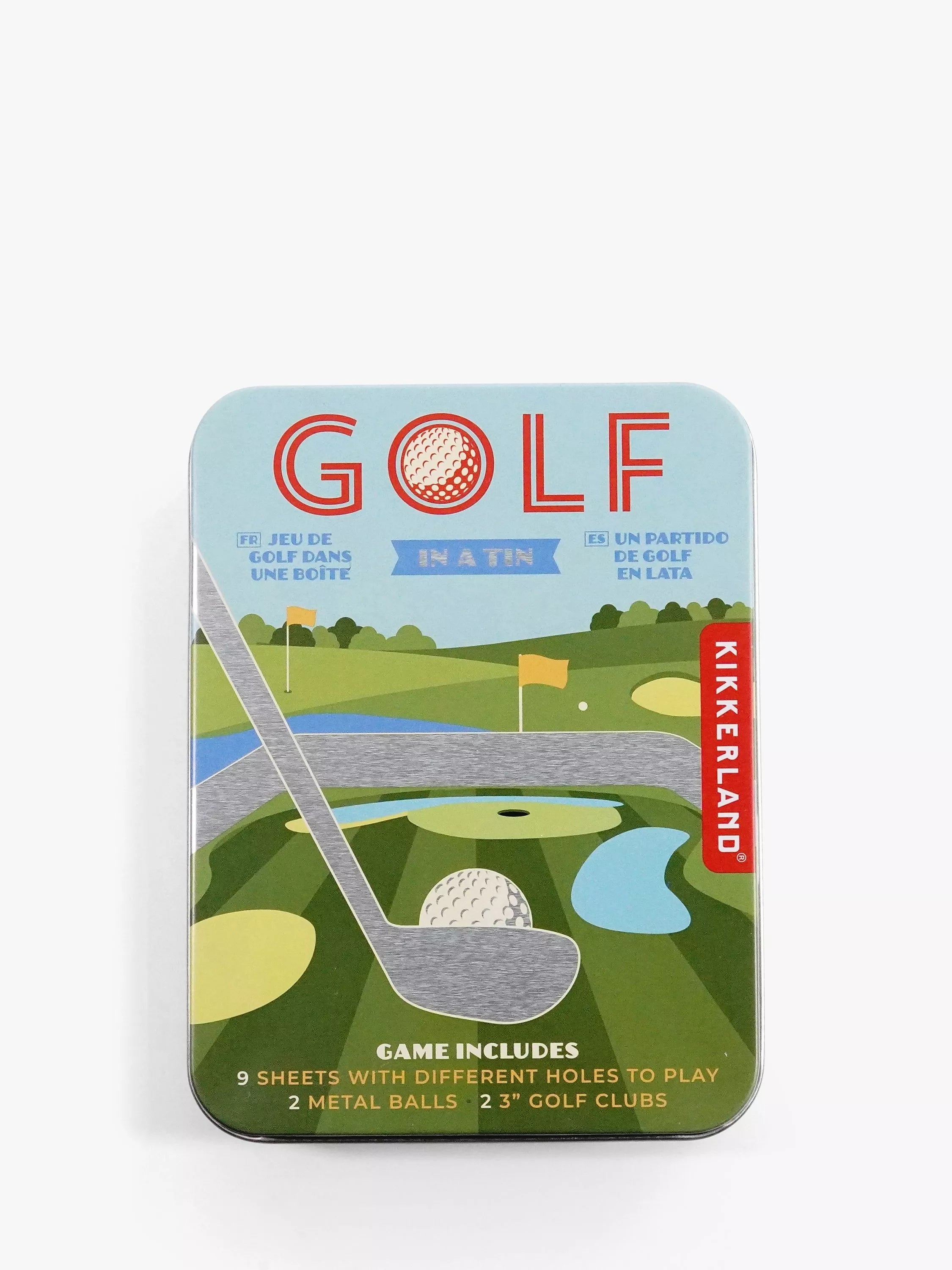 This retro game contains nine cardboard golf fields, 2 cast metal clubs and 2 metal balls. Small pond and sand are recessed. Great gift for any golf lover!