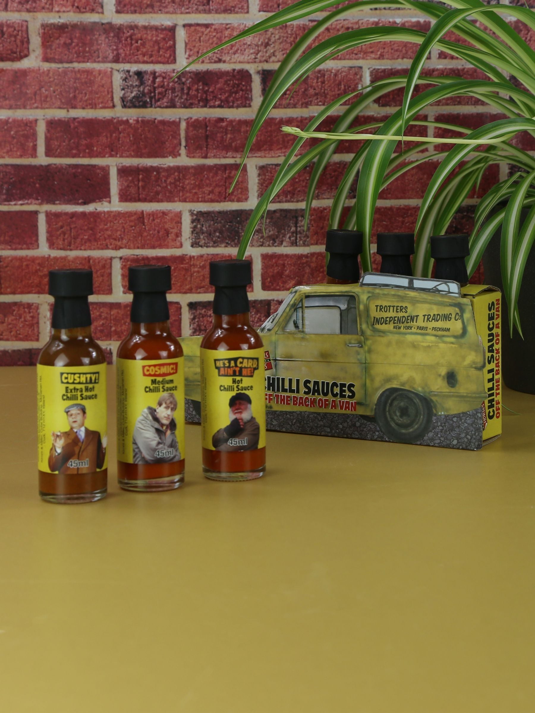 Officially licensed Only Fools and Horses Chilli Sauce Van. Can you handle the heat? We know Del Boy and Rodney can! Three fiery chilli sauces are the perfect accompaniments to spice up your meals. Housed in the iconic Reliant Robin packaging, the three fiery 45ml chilli sauces come in increasing levels of hotness: Medium chilli sauce 45ml Hot chilli sauce 45ml Extra hot chilli sauce 45ml Everyone loves this TV show - after six successful series and numerous special episodes, Only Fools and Horses has become a classic of British culture. On their quest to get rich quick and out of Peckham, Del Boy and Rodney rode around in their trademark Reliant Robin on all their money-making schemes. This gift is sure to delight fans and is the perfect novelty gift for fans, especially those who are notoriously hard to buy for. At Kimm and Miller it's our mission to create unique, memorable gifts for all of the UK and beyond. We have been busy designing, making and supplying our gift sets since 2007. In fact, our innovative, design-led approach has helped us to become the UK's market leader, winning us lots of shiny awards over the last decade. Our team are the very best at what they do, ensuring that everything runs as smoothly as a well-wrapped gift. Size: 0.