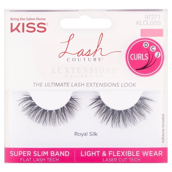 kiss lash couture luxtension strip features flat lash technology for a super slim band laser cut technology provides ultra lightweight comfortable flexible wear lashes are a mix of d c and j curls just like actual lash extensions reusable with special care contact lens friendly adhesive sold separately