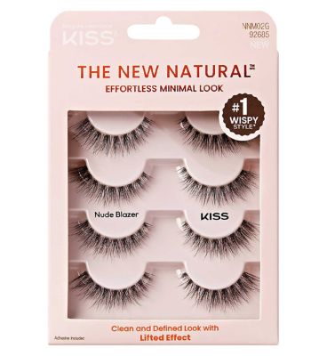 KISS offers 'The New Natural' multipack, featuring four pairs of versatile strip lashes designed for daily wear. This collection focuses on achieving an effortless, minimal look that defines and lifts the eyes subtly. Style number 02, including the popular 'Nude Blazer' option, delivers a clean and desirable aesthetic directly from the packaging.
