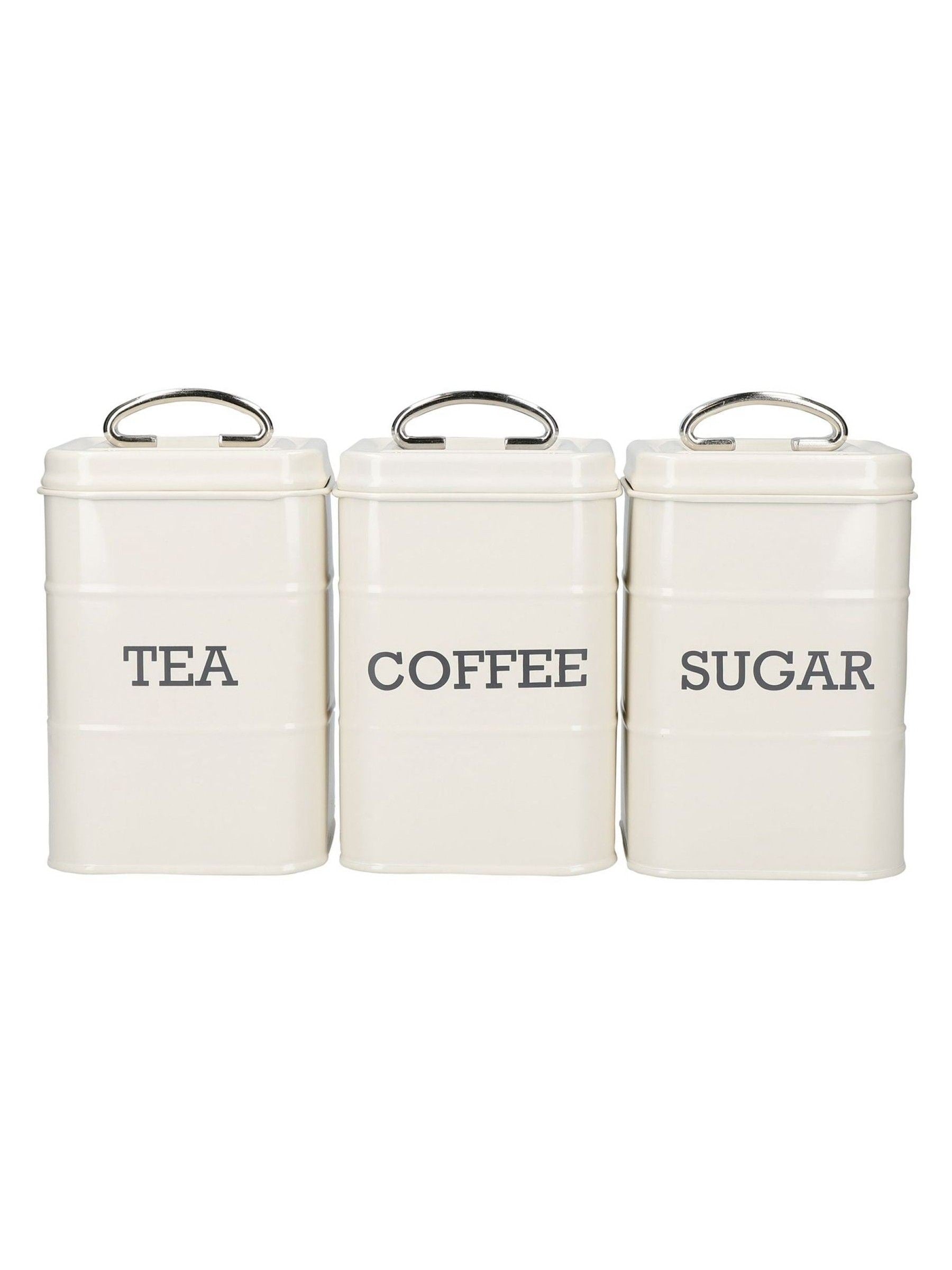 Swap unsightly supermarket boxes for these vintage-style tea, coffee and sugar tins. Features a beautiful cream powder coating and printed labels for easy organisation. Secure lids keep your tea and coffee essentials fresh and delicious for longer. Compact footprints mean they fit neatly on shelves or in unused corners . These robust metal storage tins come in an attractive gift box with a 12-month guarantee. Keep all your tea and coffee-making essentials in one place – and make that place as beautiful as can be. It's easy with this 3pc set of vintage-style storage canisters from Living Nostalgia. Leave them on a shelf or countertop and you can ditch unsightly supermarket boxes for good. The secure lids will keep contents fresh, while the classic design will add a timeless touch to your kitchen décor. Each is finished with a neat TEA , COFFEE or SUGAR label and a shiny metal handle. Makes a great gift for anyone who appreciates classic style. Hand-wash only. Dimensions (each): 11 x 11 x 17cm.