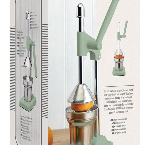 Fresh juice is easily prepared using the KitchenCraft Living Nostalgia Heavy Duty Lever Arm Juicer. This robust tool efficiently turns citrus fruit into healthy, refreshing juice with a simple turn of the handle. Inspired by vintage designs, it suits both rustic and modern kitchens, featuring an English Sage finish and steel highlights.