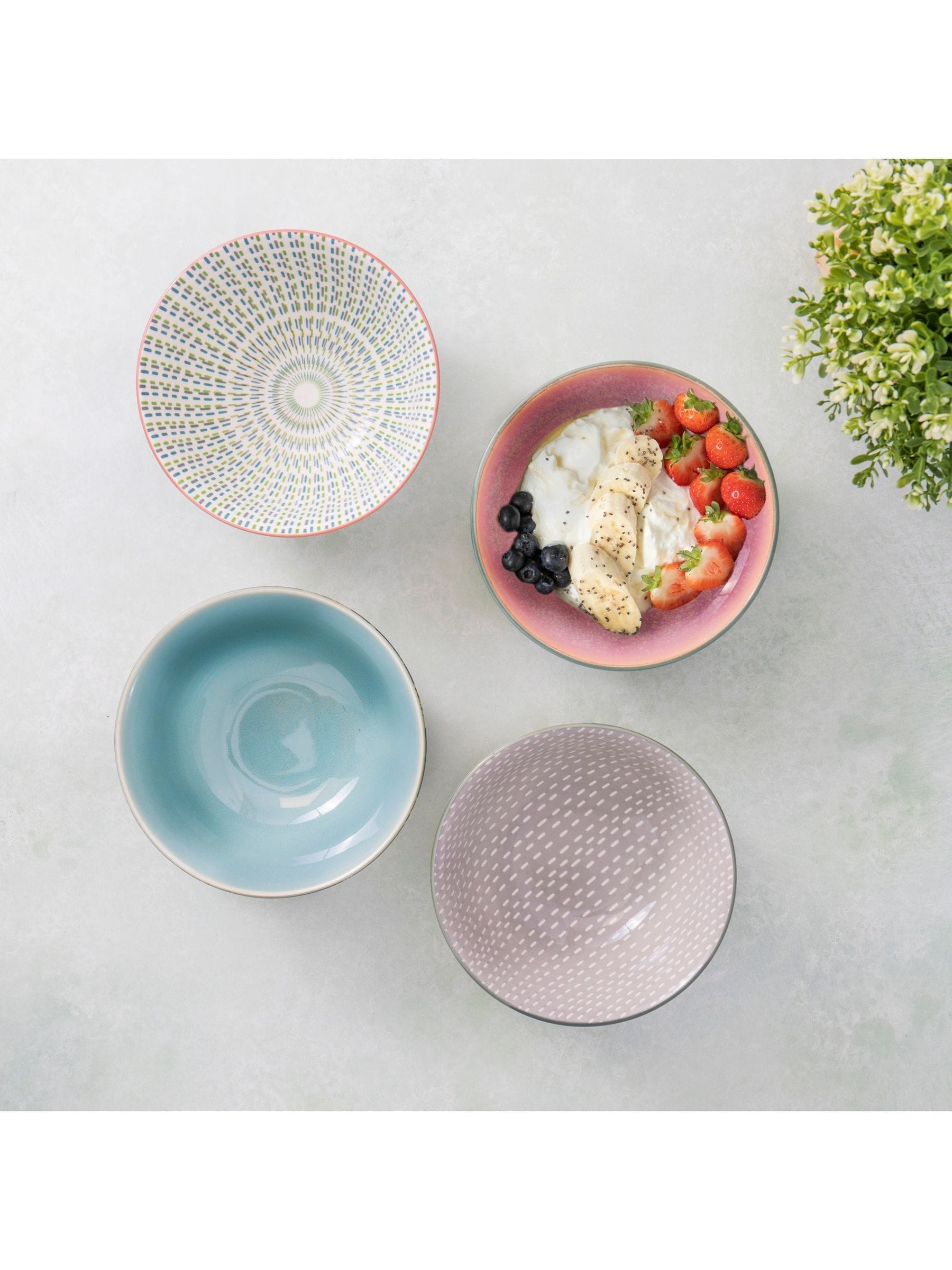 Great-value set includes 4 x robust ceramic cereal bowls. Jazz up your crockery cupboard with the 4 funky floral designs. Rely on them for serving cereal, soups, ramen, snacks or healthy Buddha bowls. Made of robust, dishwasher-safe stoneware, they're ideal for everyday use. These breakfast bowls come ready to wrap in a KitchenCraft gift box, complete with a 12-month guarantee. Need to refresh your crockery collection? Know a friend with a new house or spouse? This colourful cereal bowl set is just what's needed. It includes four bowls, each with a distinctively delightful design. Use them every day for cereal, snacks, ramen or healthy, tasty Buddha bowls. Made of robust stoneware, they're built to stand up to regular use. Need to reheat, eat and go? Good news: the bowls are microwave-safe – and dishwasher-safe for good measure. Designed in the UK by KitchenCraft. Each measures 15cm wide by 7cm tall.