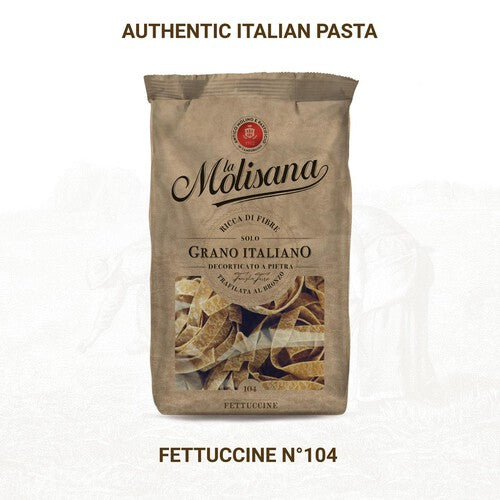 La Molisana presents Wholewheat Fettuccine Pasta Integrali No 104, continuing a four-generation commitment to pasta artistry. This fettuccine, slightly narrower than tagliatelle, offers a rustic texture perfect for pairing with robust sauces.