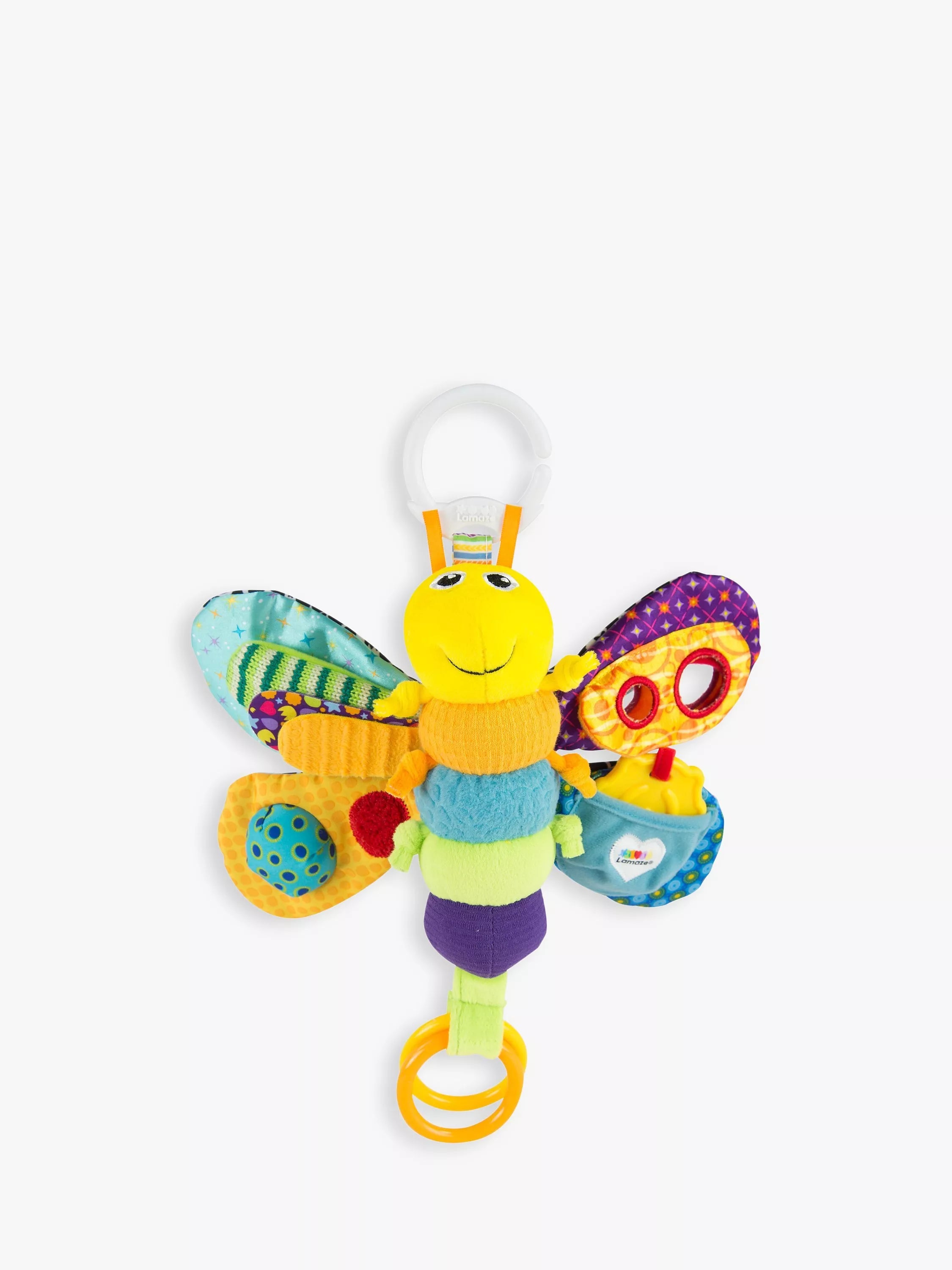 Keep your little one engaged and entertained for hours with the Lamaze Freddie the Firefly. This friendly bug has a soft velour body with lots of bright colours, patterns and textures. His layered wings include a peek-a-boo mirror for interactive play and multiple textures, shapes and crinkles. Filled with features; Freddie has a squeaker, clinking rings, tethered ladybug teether and knotted legs perfect for chewing. He has bright colours on his tummy and high-contrast black and white patterns on his back. Plus, the Lamaze clip lets you hook Freddie to strollers, carriers and diaper bags so you can take him with you wherever you go.