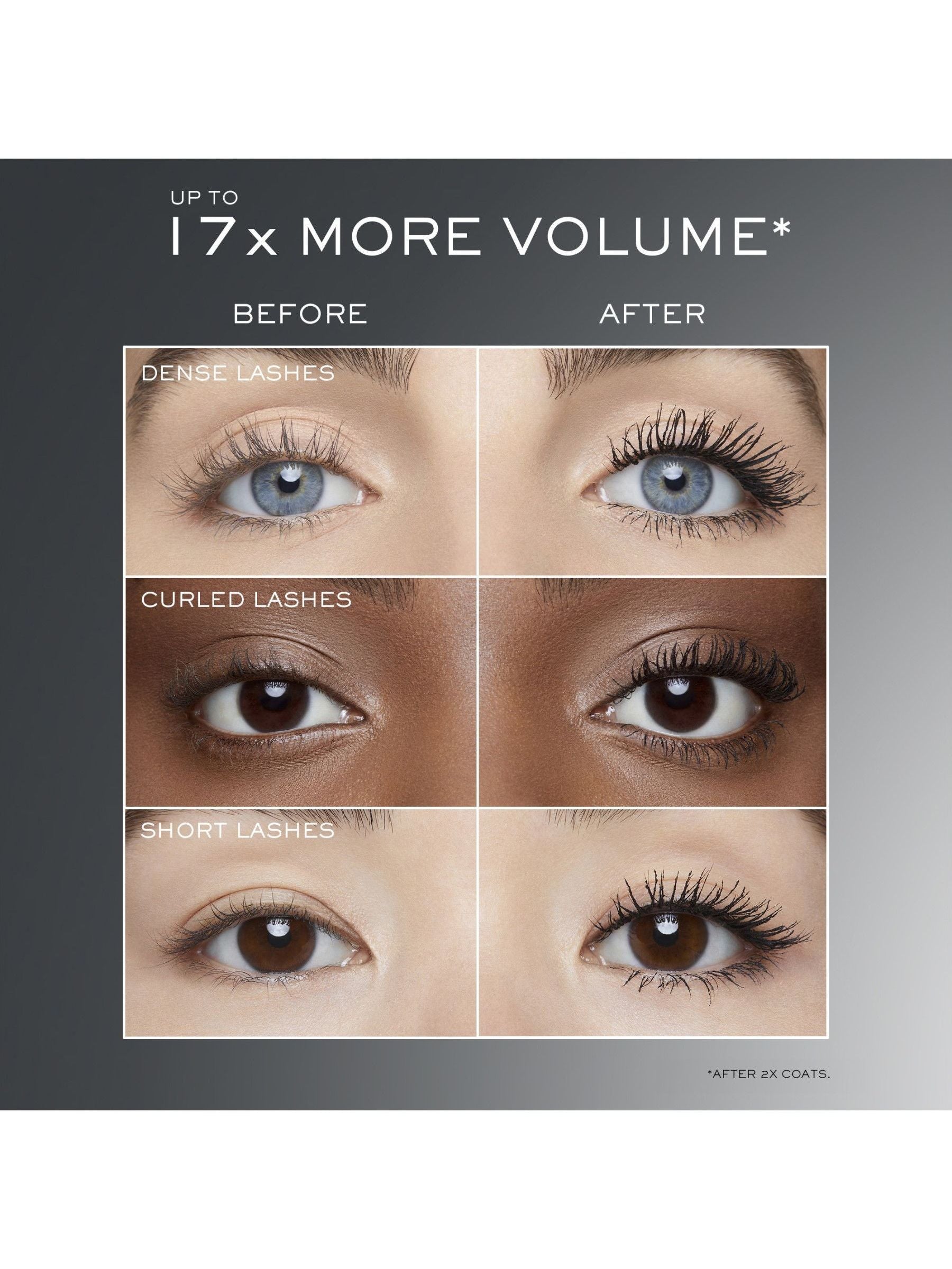 Up to 17X more volume up to 24H wear all day no smudge enriched with 2% bonding complex nourishing lashes to support strength and condition. After 2x Coats.