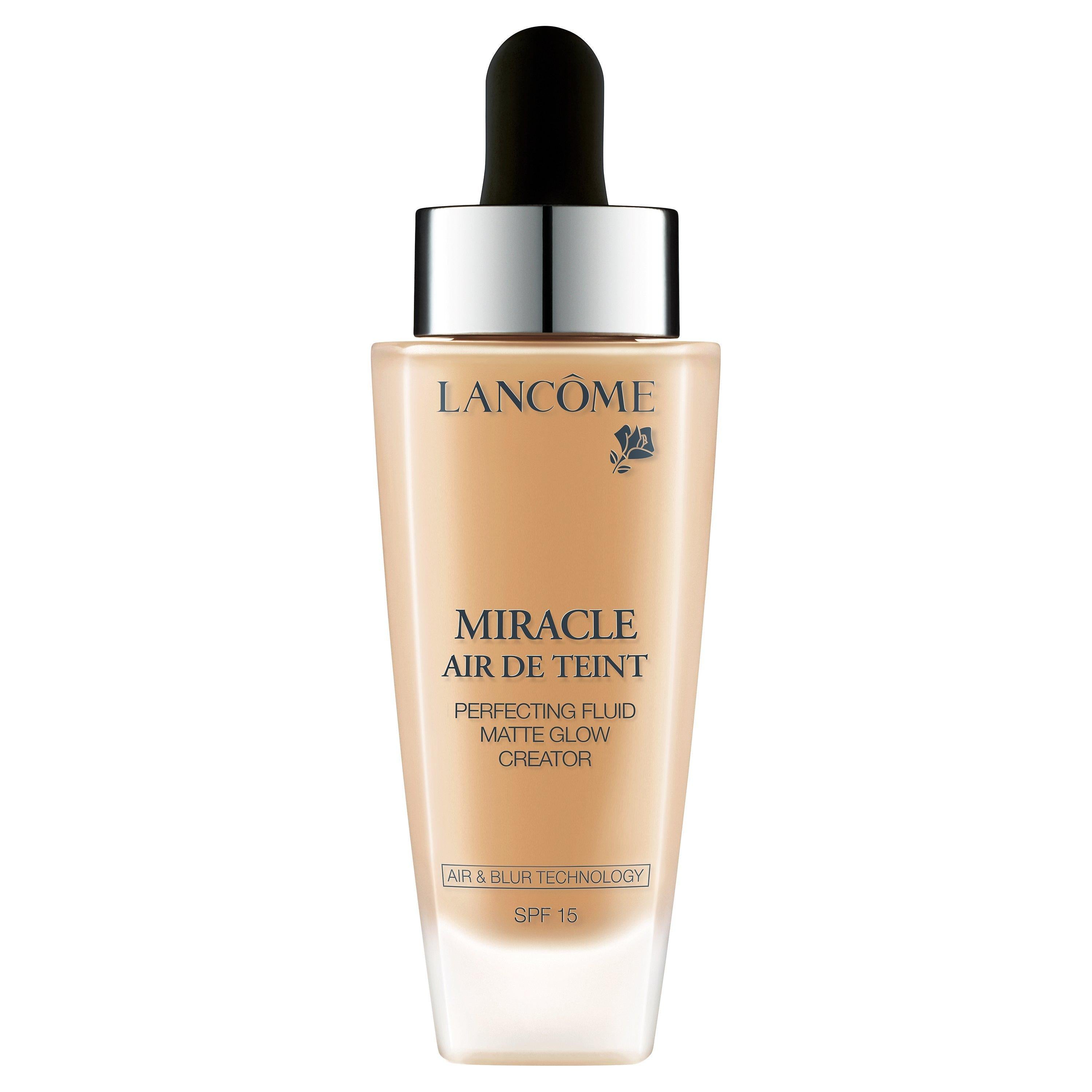 Read MoreLancôme's 1st perfecting fluid foundation that feels as light as air. 100% of women forget they are wearing it*. For our ultimate 'no make-up' look. For the 1st time, Lancôme has incorporated powder and blurring technology into its foundation. To create a new, incredibly lightweight formula. • Perfecting fluid • Invisible nude finish • Air & blur technology *Self evaluation by 60 women Benefits: Weightless feeling correction - the Blur innovation. Miracle Air de Teint blurs and corrects the look of imperfections. The complexion appears translucent, matte and even, and glowing with radiance. Miracle for tailor-made natural looking results: finish, lightness, perfection...find yours. How to use: Use a drop of Miracle Air de Teint and apply with fingers from the centre of the face working outwards. This beautiful texture is easy to blend and provides a natural looking make-up result.