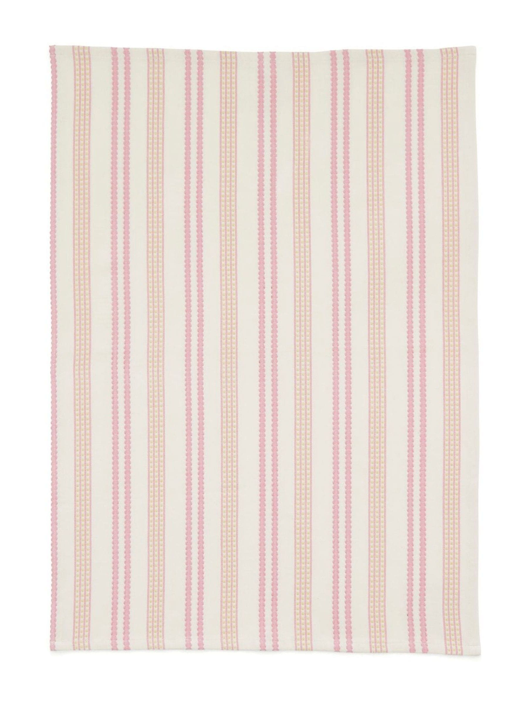 Pack of two tea towels, one with a woven yarn dye stripe design and the second design with a printed leaf pattern all-over in yellow and pink, both completed with hanging loop.