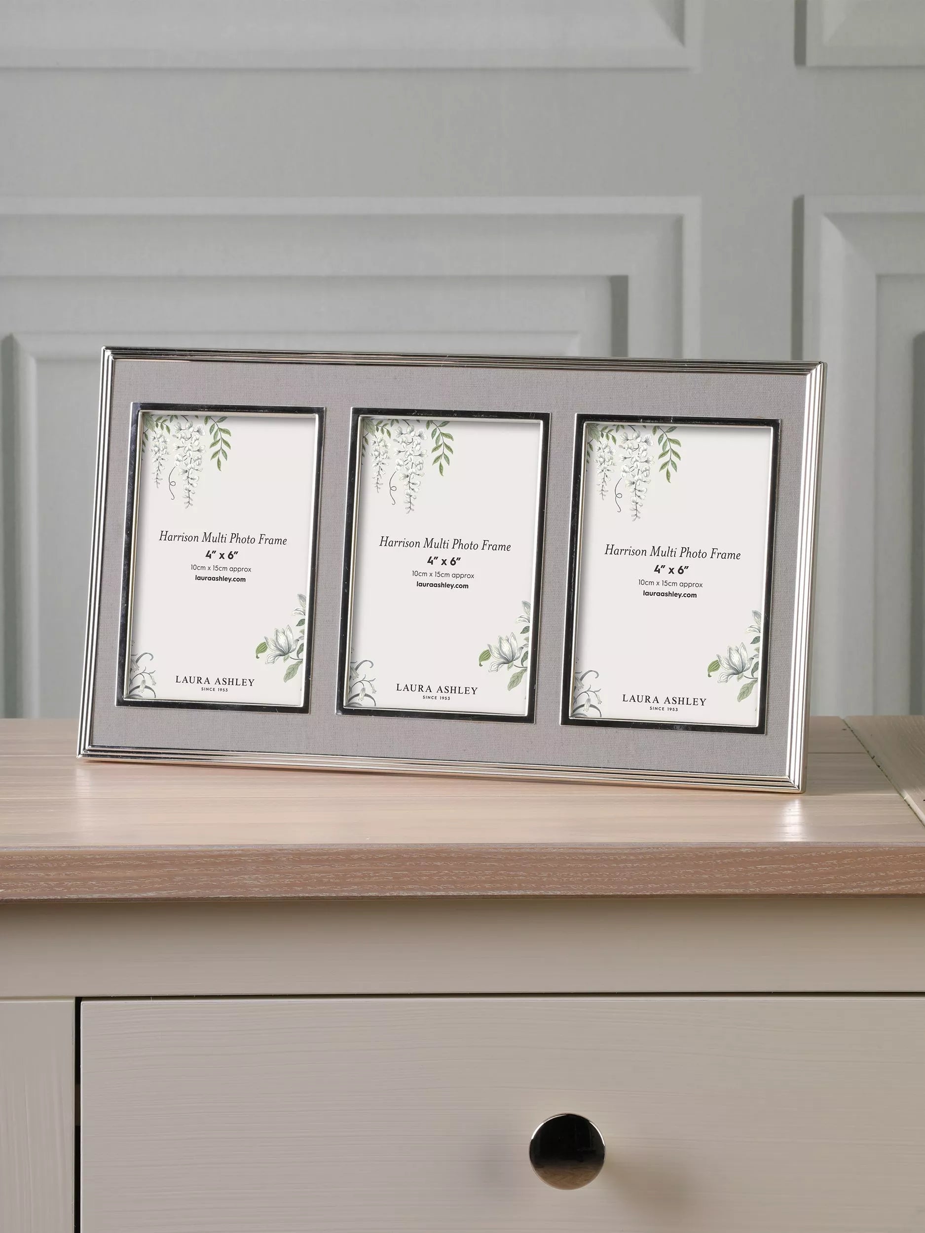 With a silver-plated metal frame faced in pale linen fabric and with raised beading, the elegant Harrison photograph frame from Laura Ashley is perfect for displaying your most treasured images.
