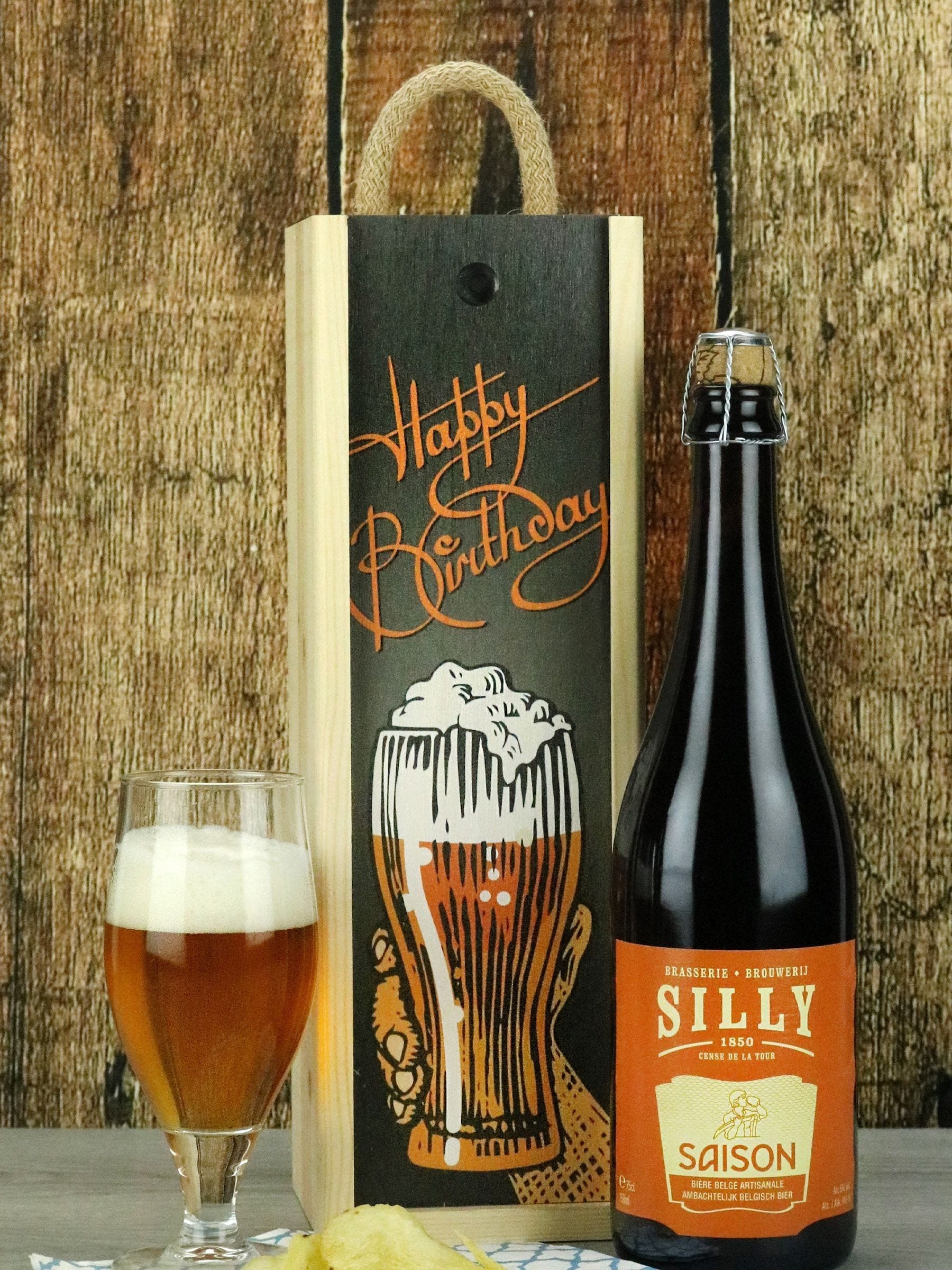 Say Happy Birthday to a real ale lover with this Belgian Beer gift. Featuring the Saison beer from the Silly Brasserie. Presented in a printed wooden gift box. Volume 750ml, ABV 5.0%. (Glass not included. If a beer is out of stock a suitable replacement will be substituted).