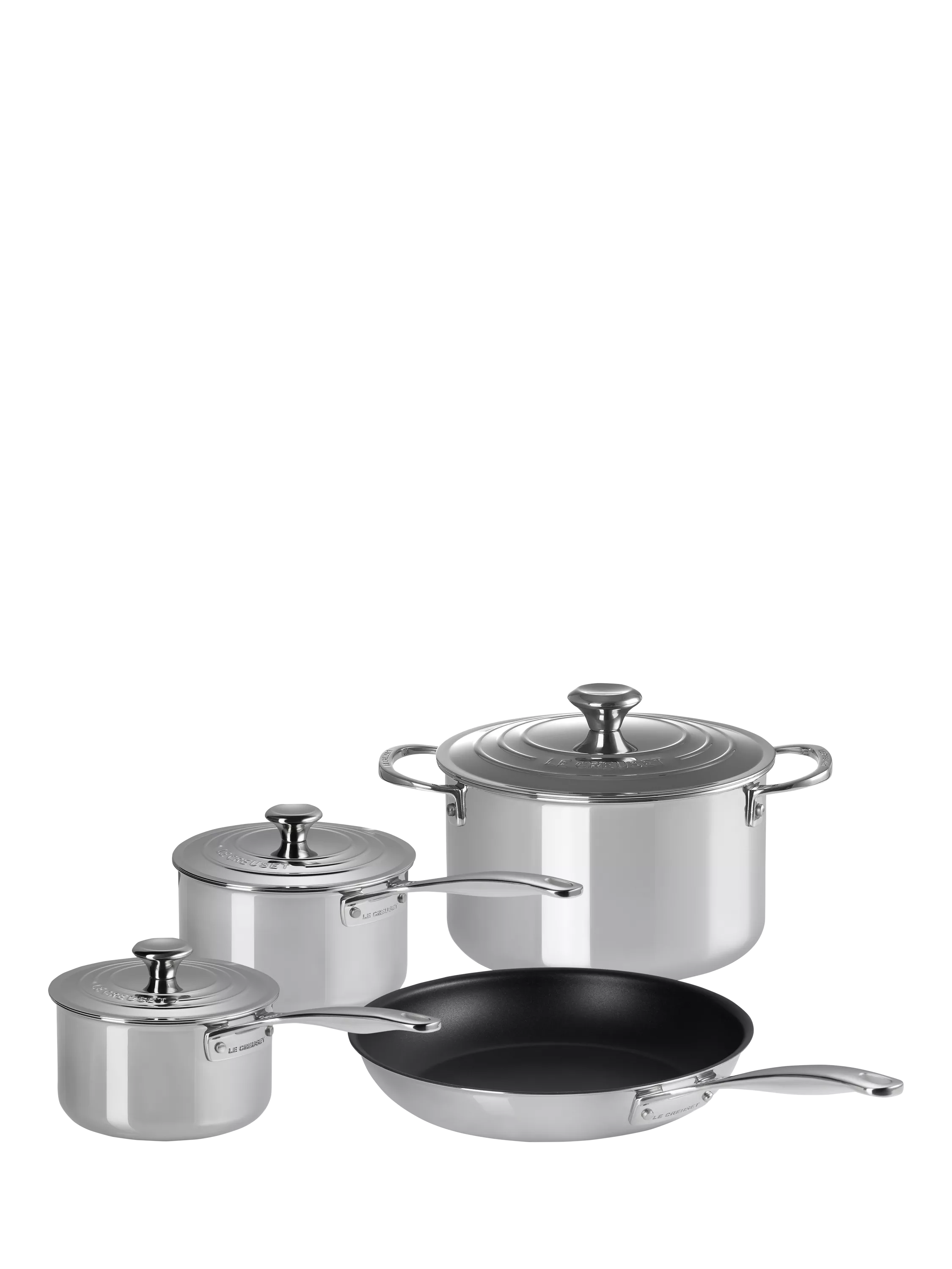 Le Creuset's 3-Ply Stainless Steel range has a gleaming, mirror-polished finish with lids featuring the iconic Le Creuset three-ring design.