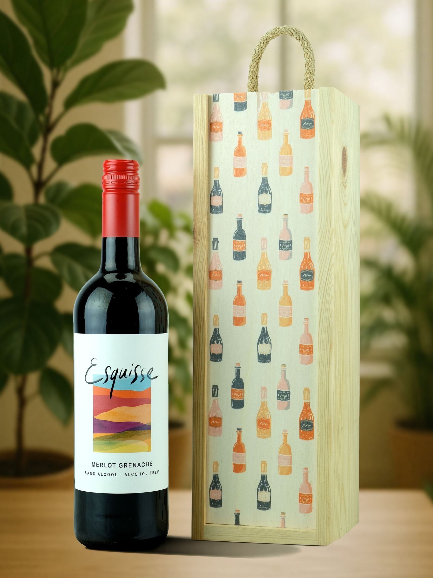 All the flavour, none of the alcohol. This fresh and indulgent red is made from premium French Merlot and Grenache grapes, delivering rich character, smooth texture, and vibrant complexity. Thoughtfully presented in a wooden gift box printed with wine bottles. Ideal for elegant, alcohol-free gifting. Contents: Esquisse Rouge Merlot Grenache Alcohol Free 750ml - 0% ABV If any wines are unavailable a suitable replacement will be substituted. UK Mainland Delivery Only.