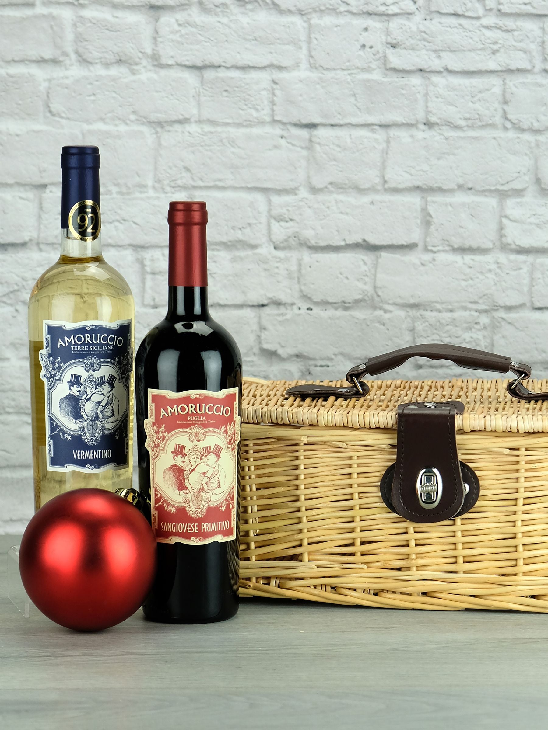 An Italian wine hamper gift featuring a smooth Sangiovese-Primitivo from Puglia and a fresh Vermentino from Sicily. Presented in a woven hamper with leather handle. 2x 750ml Bottles.