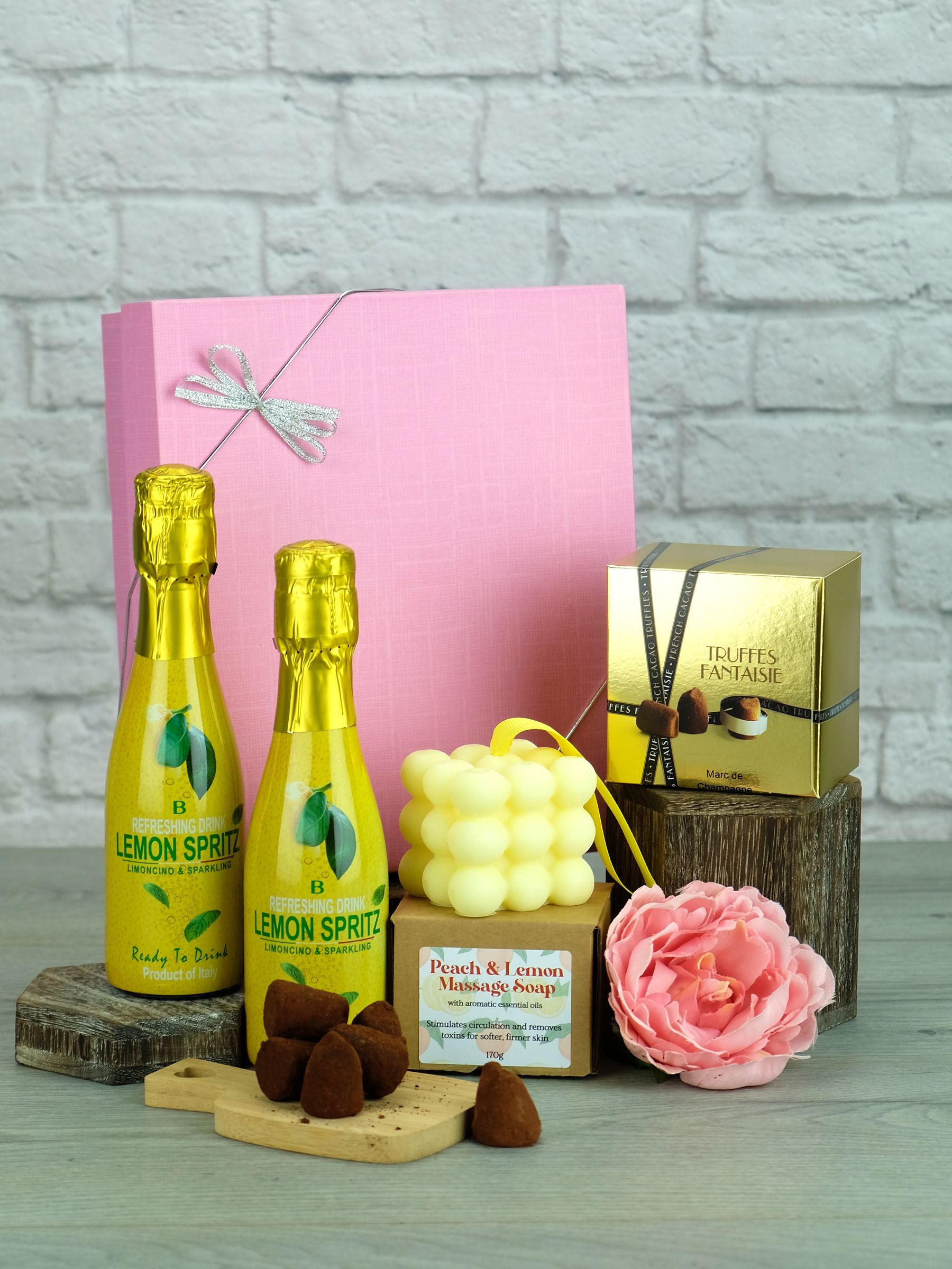 Pamper someone special with this relaxing gift set. Featuring two bottles of Lemon Spritz sparkling cocktail, a box of Champagne chocolate truffles and an invigorating massage soap. Contents: Bottega Rose Prosecco 2x 200ml - 11.5% ABV. Marc de Champagne truffles 100g. Massage Soap 170g. If any items are unavailable a suitable replacement will be substituted.