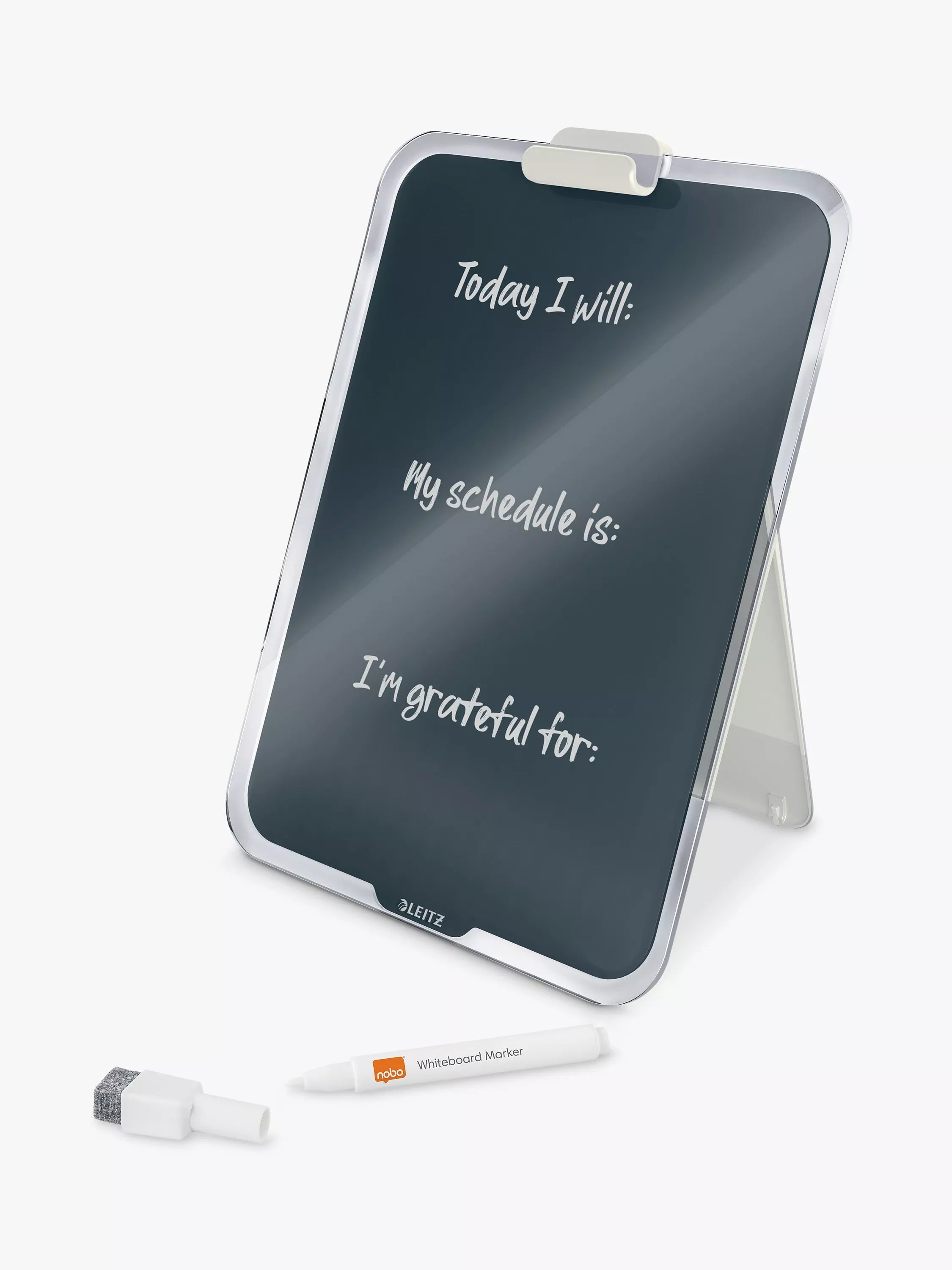 A Leitz Cosy Dry erase glass whiteboard desktop easel. With a stylish frameless design, the dry wipe surface makes it an excellent memo board and note taking tool, simply write, wipe clean away and start afresh, ideal for use at home, and great with the kids for home schooling. Includes a Nobo Dry Erase White Marker.