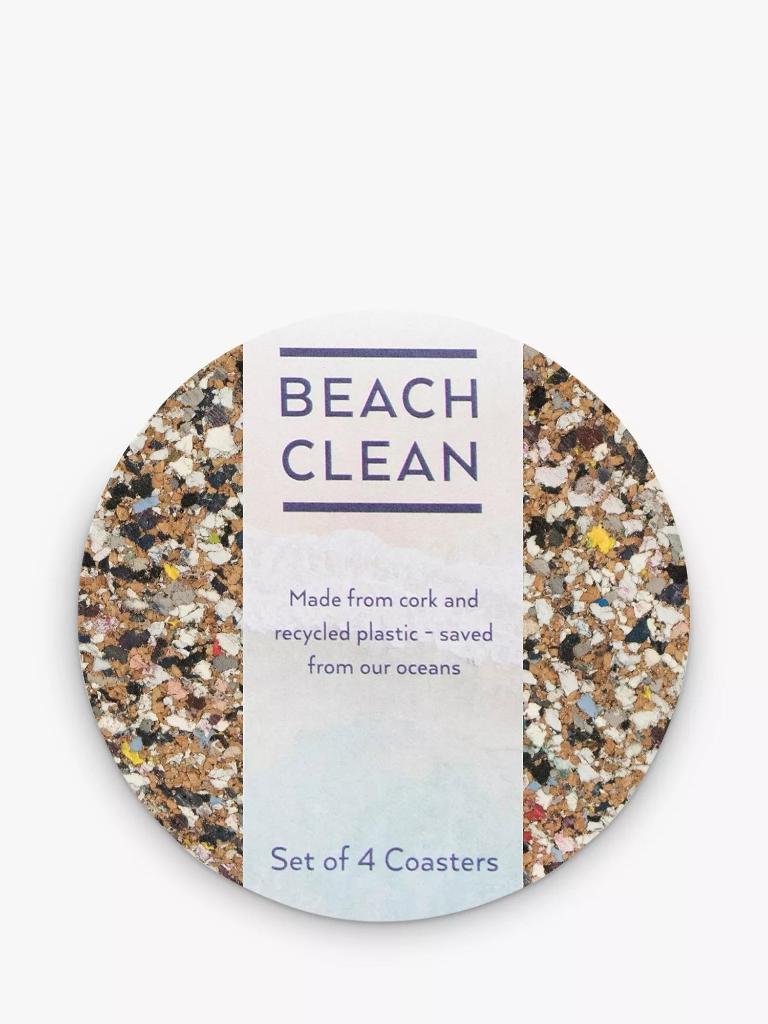 A set of four round coasters from LIGA's Beach Clean collection, made from natural cork and recycled, food-safe EVA plastics, saved from the oceans. Variations in the materials create slightly different patterns and colours from item to item, making each one unique.
