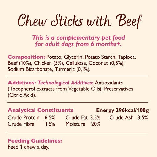 Chew Sticks with Beef. This is a complementary pet food for adult dogs from 6 months+.